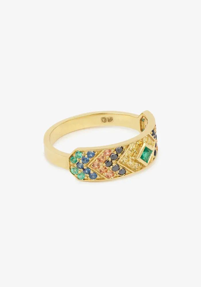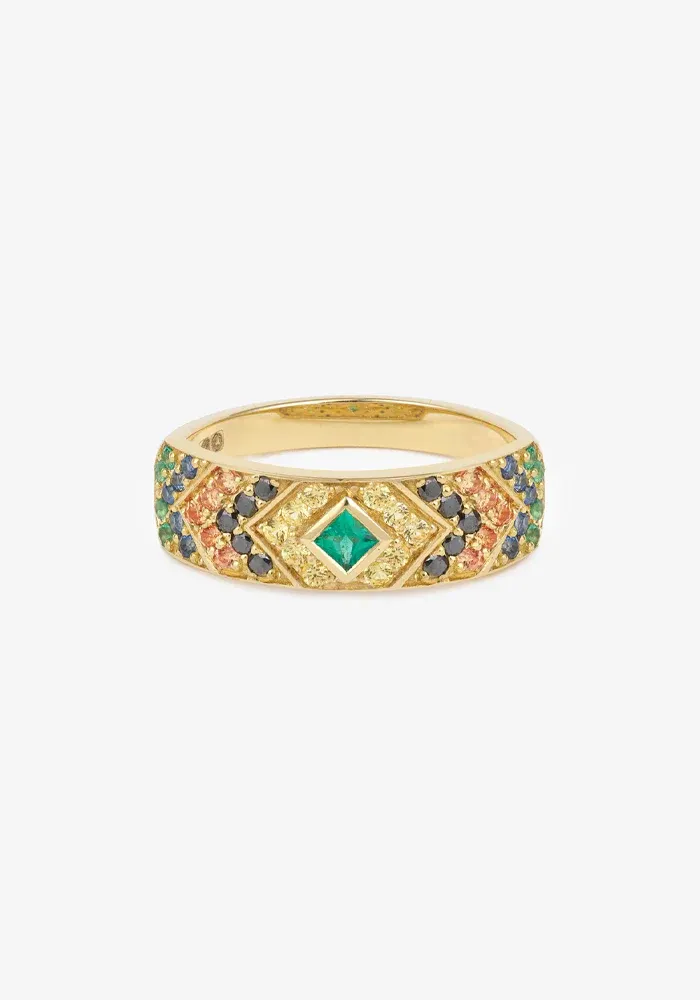 Bague Ani 3 Verte réalisée à la main en or jaune recyclé 18 carats et sertie de 49 pierres précieuses : 10 saphirs jaunes, 10 diamants noirs, 10 saphirs cognac, 10 saphirs bleus et 9 émeraudes dont 1 taille Princesse.