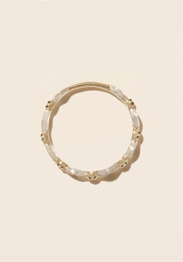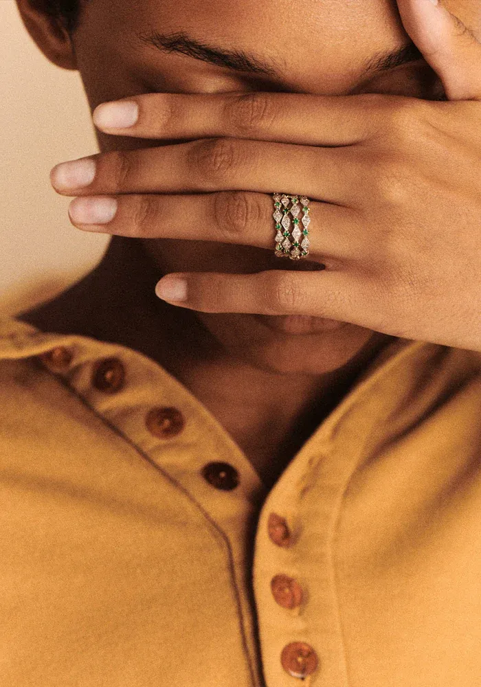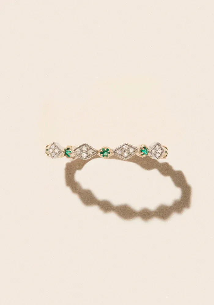 Bague Ava N°1 en or jaune 9 carats, argent 925 pavée de diamants et d’émeraudes.