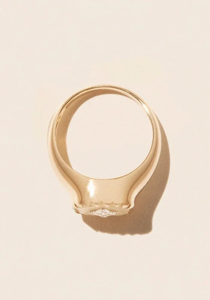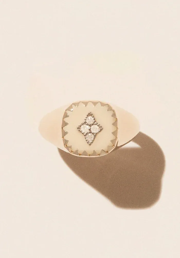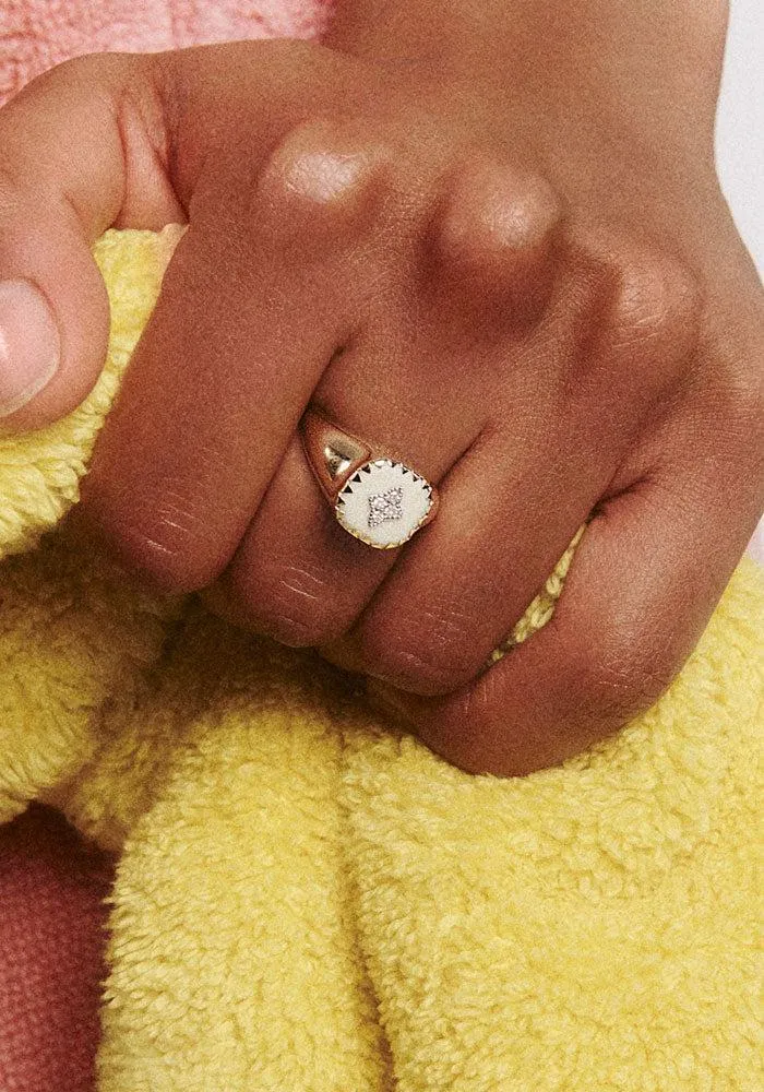Bague chevalière Pierrot en or jaune et blanc 9 carats en bakelite et diamants.
