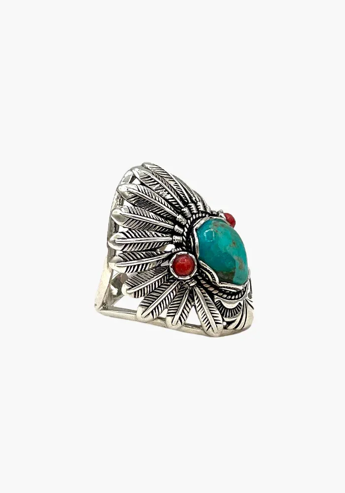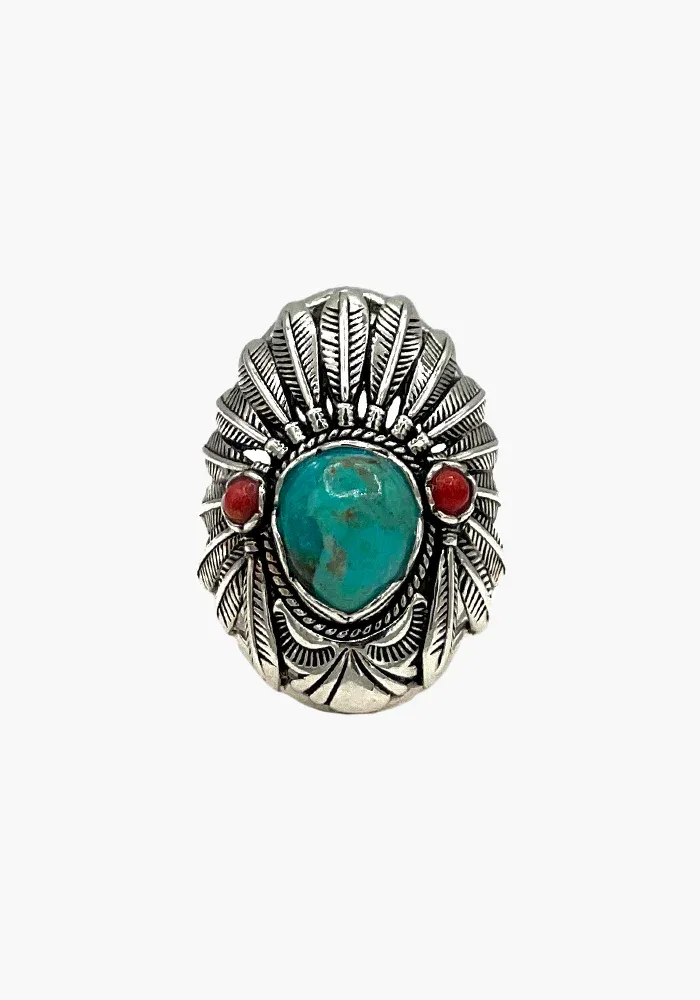 Bague en argent 925 en forme de coiffe indienne avec une turquoise au centre et deux cornaline.