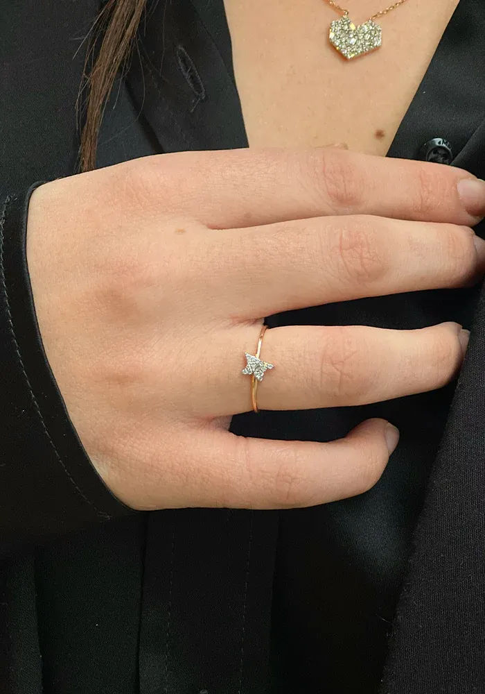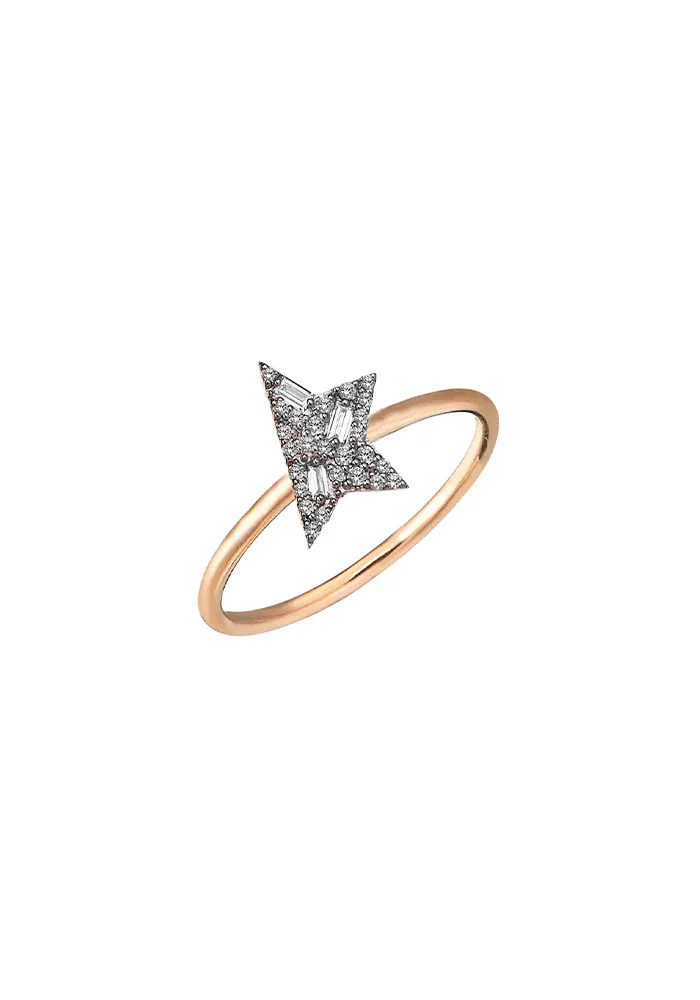 Bague Comet en or rose 14 carats avec une étoile coupée pavée de diamants blancs baguettes et non baguettes.
