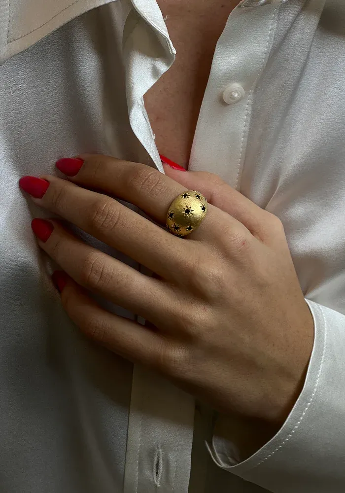 Bague constellation en forme d’anneau bombé avec des zircons en forme d’étoiles noires.