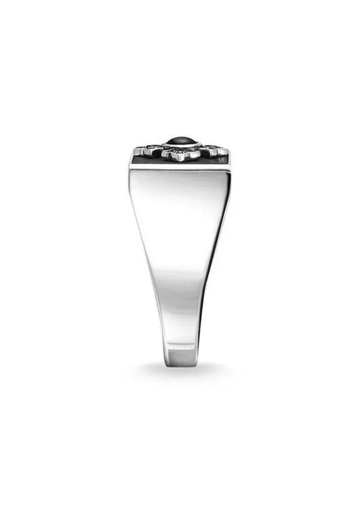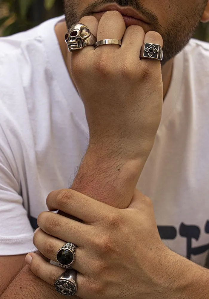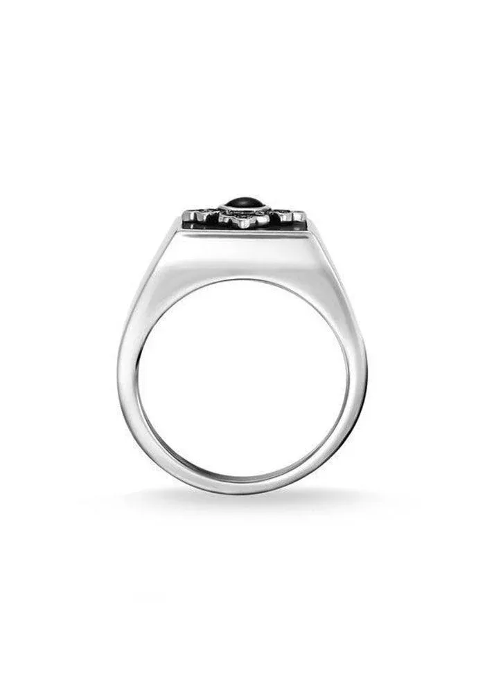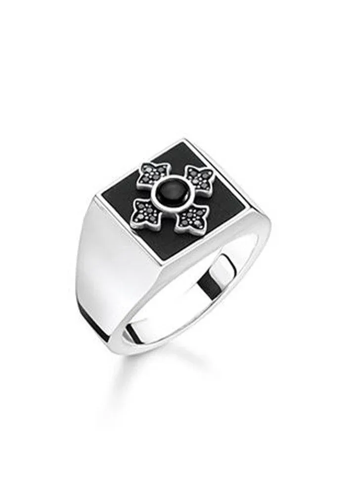Bague Croix Royalty en argent 925, noircie sur le dessus avec une croix dont le centre est en onyx.