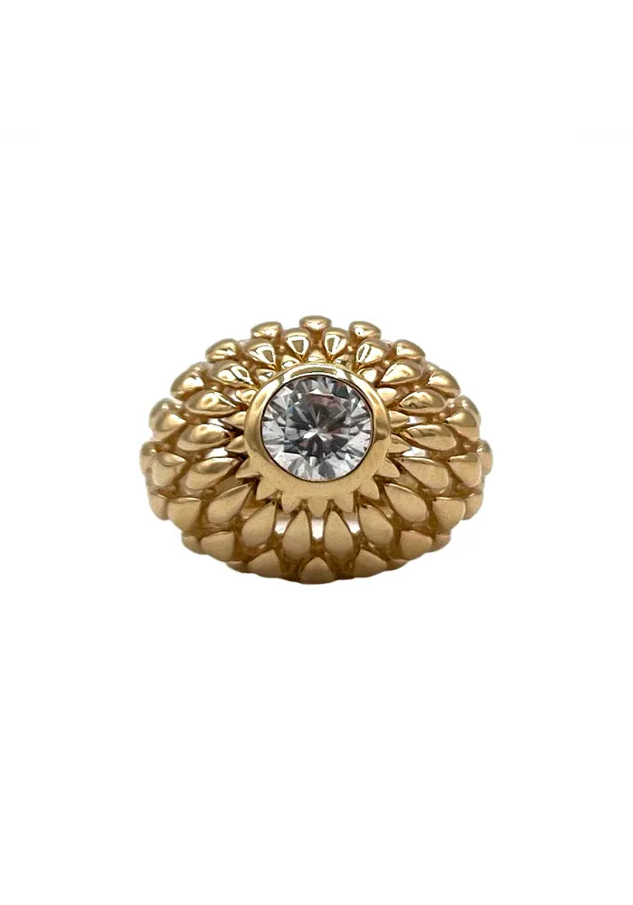 La Bague Debby est une bague bombée en forme de fleur, avec un strass rond en son centre, entouré de multiples pétales ovales accolés en plaqué or jaune.