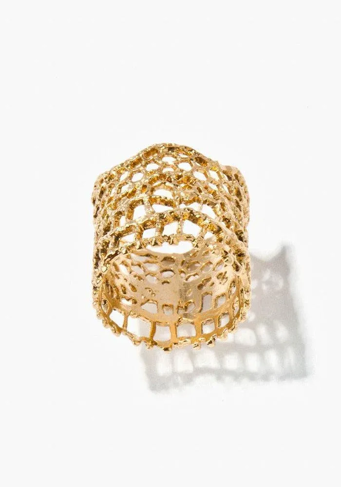 Bague Dentelle Vintage ajourée et large en plaqué or jaune vieilli.