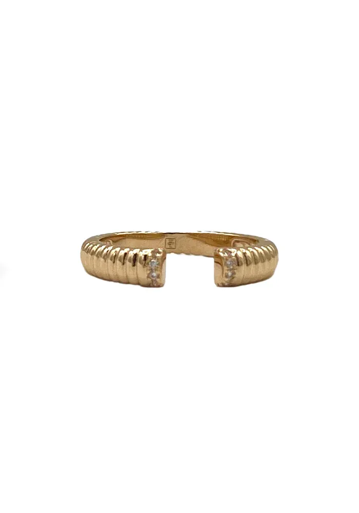 La bague Dina est un modèle tube strié, ouvert avec des strass délicatement disposés sur les rebords de l’ouverture.