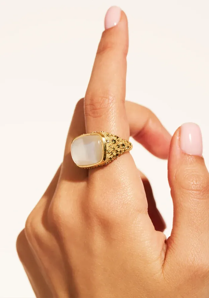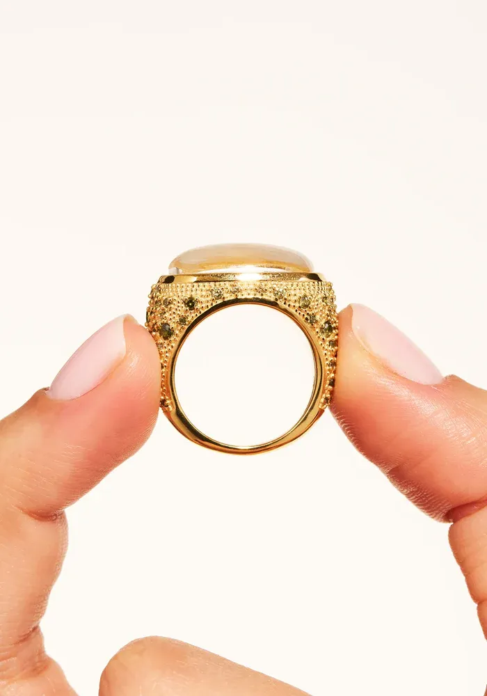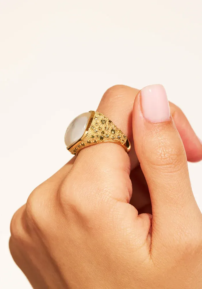 Bague Empreinte épaisse en plaqué or avec une nacre rectangulaire donc les bords sont arrondis et des zircons kaki.