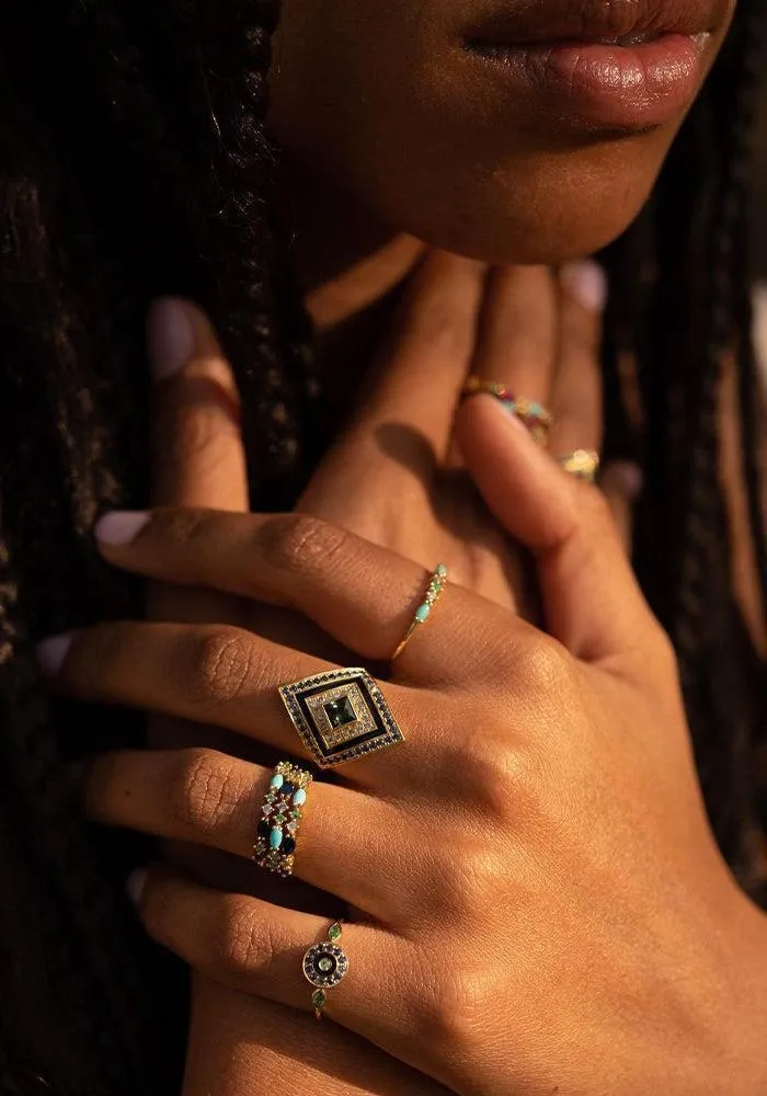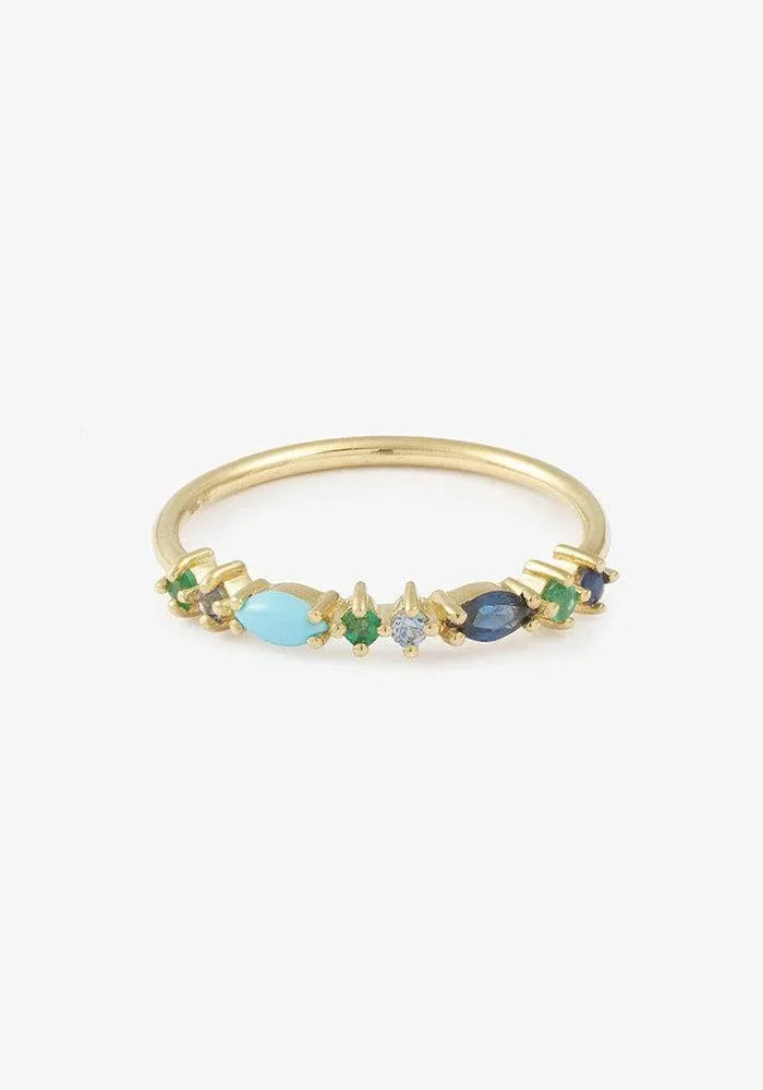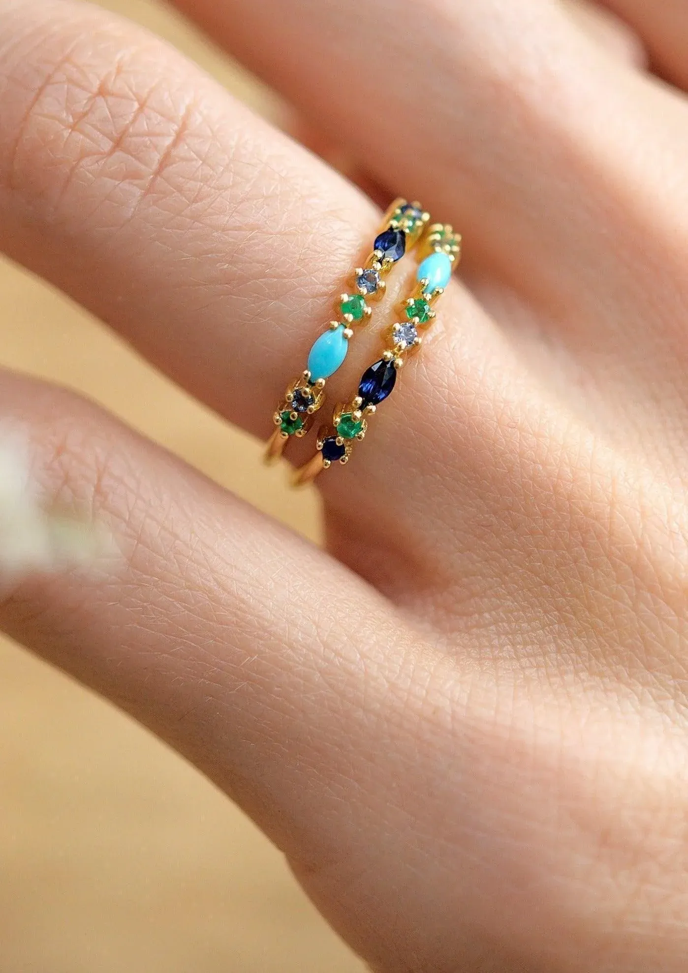 Bague Gaia 2 bleue est réalisée à la main en or jaune recyclé 18 carats et sertie 8 pierres précieuses (alternant taille Brillant et taille Marquise) : 3 émeraudes, 2 saphirs bleu ciel, 2 saphirs bleu marine (dont un taille Marquise) et une turquoise (taille Marquise).