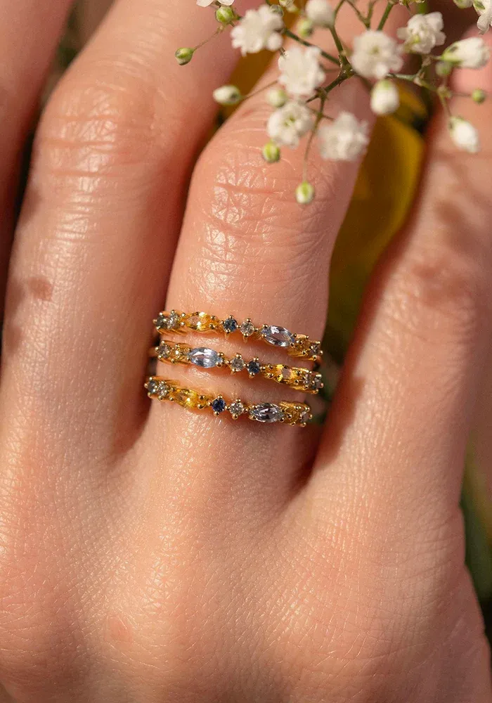 Bague Gaia 2 givre est réalisée à la main en or jaune 18 carats et sertie de 8 pierres précieuses (alternance taille brillant et taille marquise) : 3 saphirs bleu ciel, 2 saphirs jaunes et diamants « sel et poivre ».
