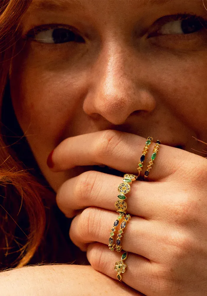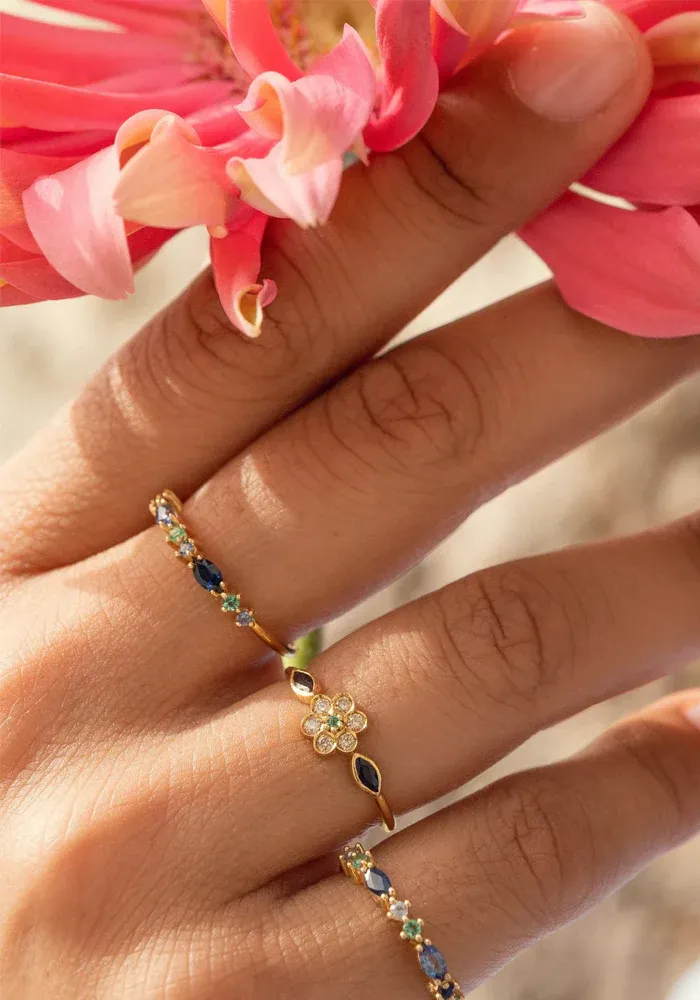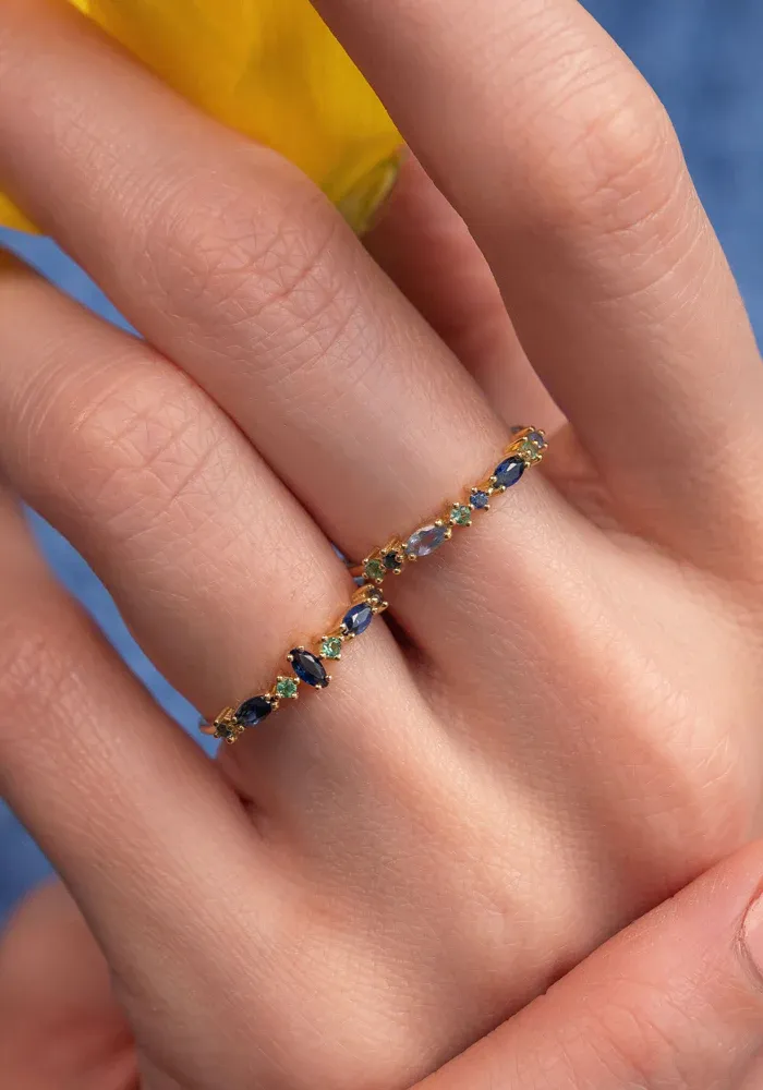 Bague Gaia 2 Marine en or jaune recyclé 18 carats et sertie de 8 pierres précieuses (une alternance de taille Brillant et de taille Marquise) : 3 émeraudes, 3 saphirs bleu ciel dont 1 taille Marquise, 2 saphirs bleu marine dont 1 taille Marquise.