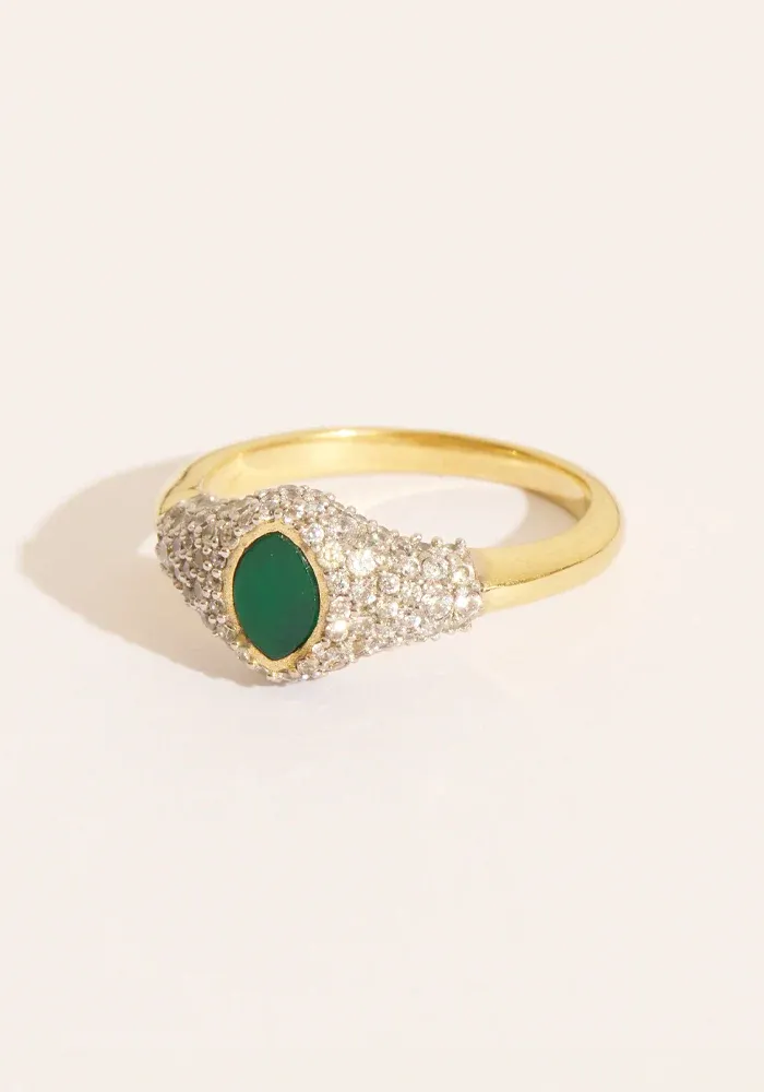 Bague Gigi type chevalière en laiton doré à l’or fin 18 carats décorée d’une onyx verte ovale et de zircons blancs.