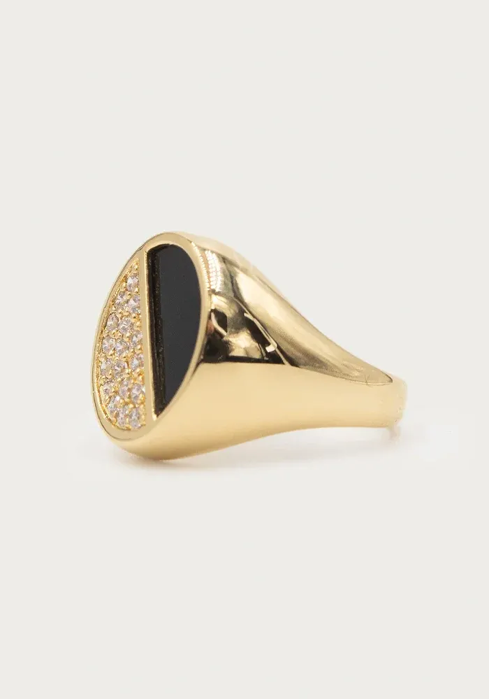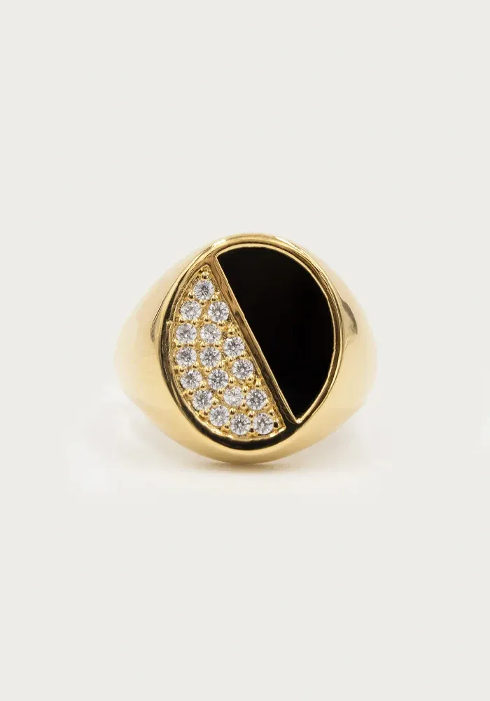 Bague Halo avec un ovale séparé en deux dont une partie est en onyx noire et l’autre est pavée de strass.