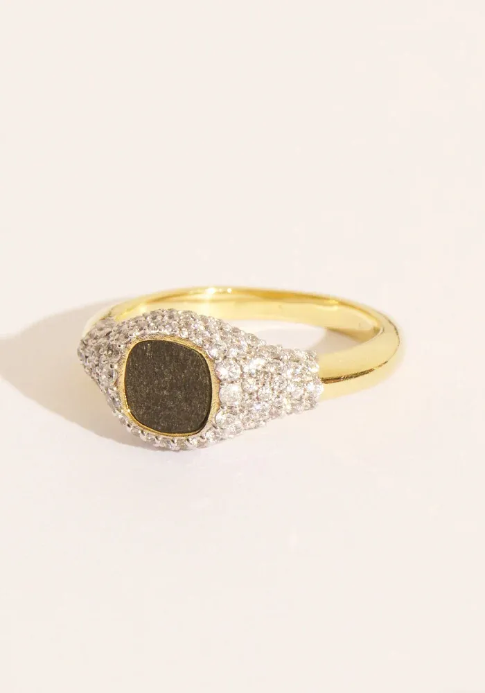 Bague Holy type chevalière en laiton doré à l’or fin 18 carats décorée d’une obsidienne carrés avec les bords arrondis et de zircons blancs.