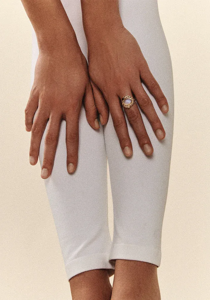 Bague Jasmine en or jaune 9 carats avec une pierre de lune ovale entourée de diamants. blancs ronds et d’une tourmaline verte ronde.
