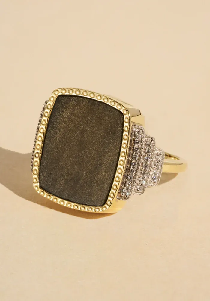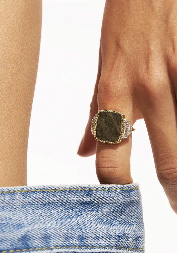 Bague Kara en laiton doré à l’or fin 18k avec une obsidienne des zircons sur les côtés.