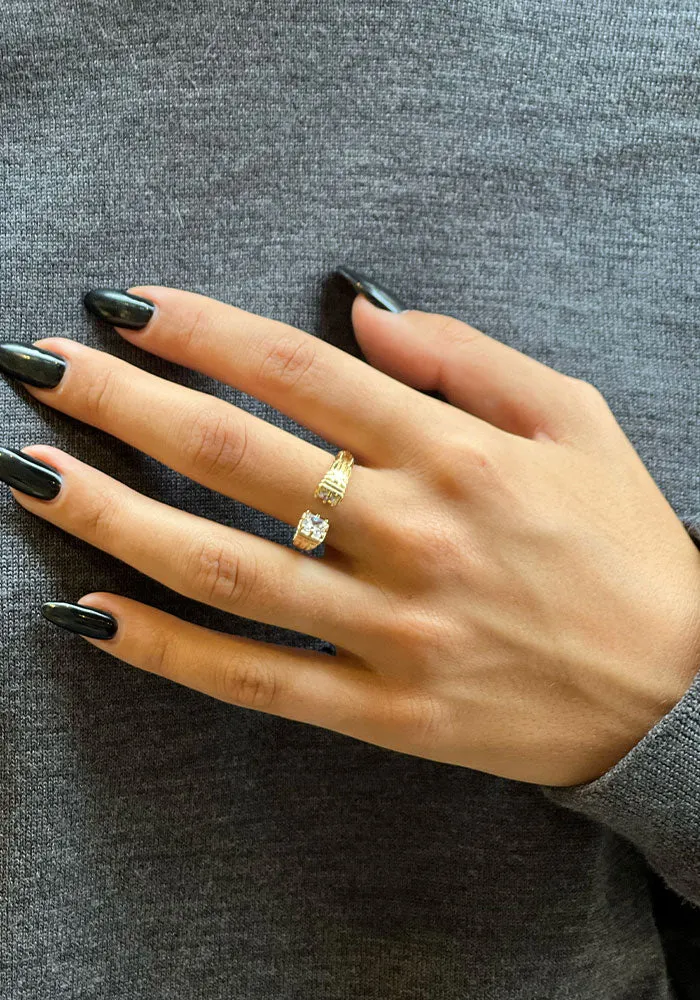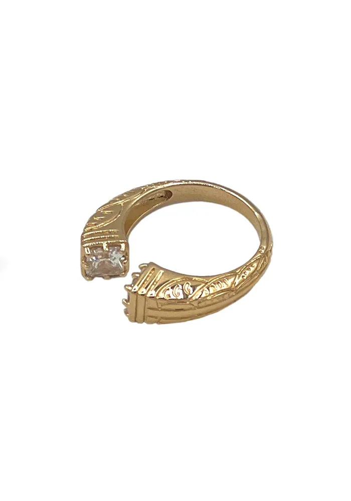Bague Kary ouverte avec des bouts carrés, ornée de strass carrés de grande taille maintenus par 8 griffes.