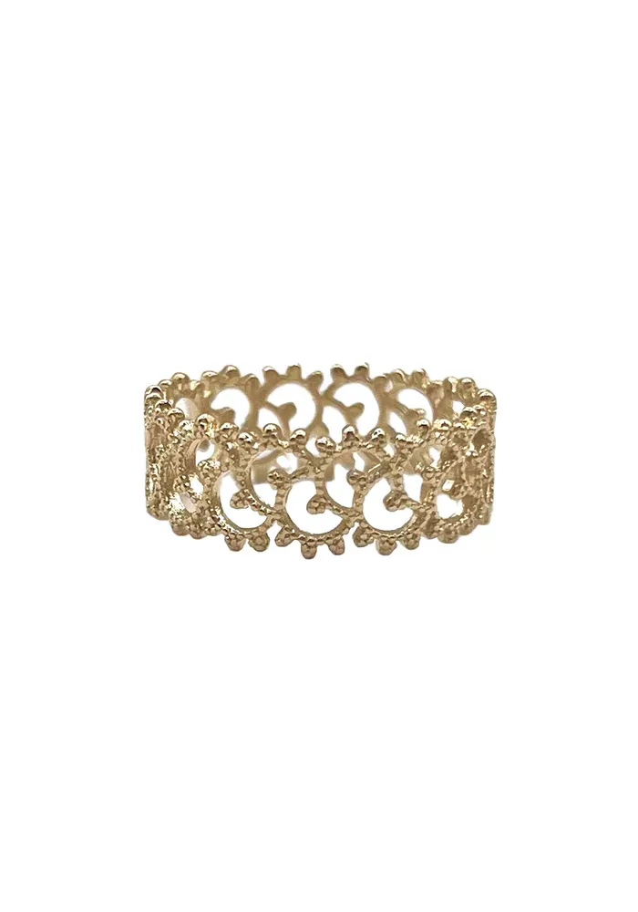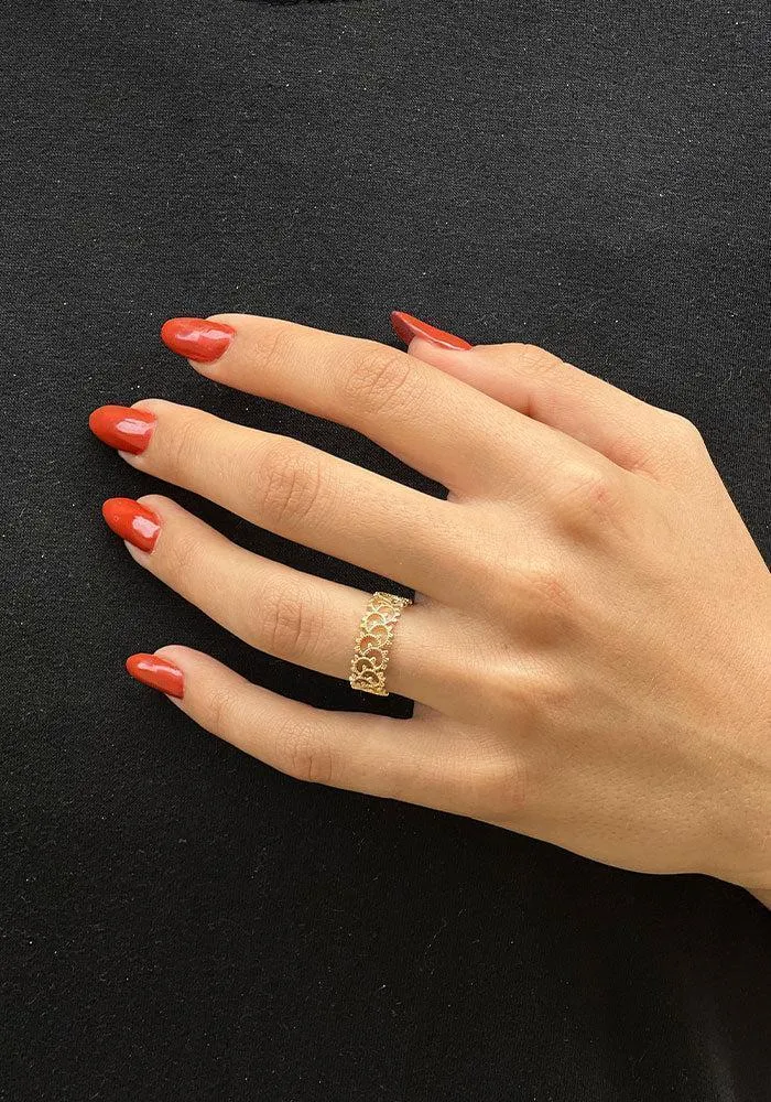 La bague Lany présente un bandeau large orné de multiples ronds crantés et ajourés en plaqué or.