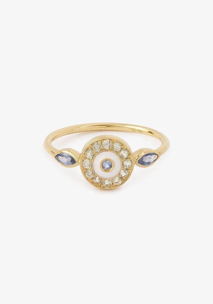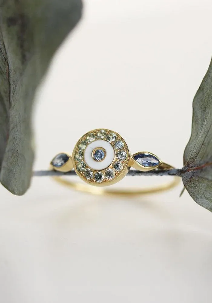 Bague Luna 1 bleue est réalisée à la main en or jaune recyclé 18 carats et sertie de 15 pierres précieuses : 3 saphirs bleus lavande (dont 2 taille Marquise) et 12 saphirs verts citron.
