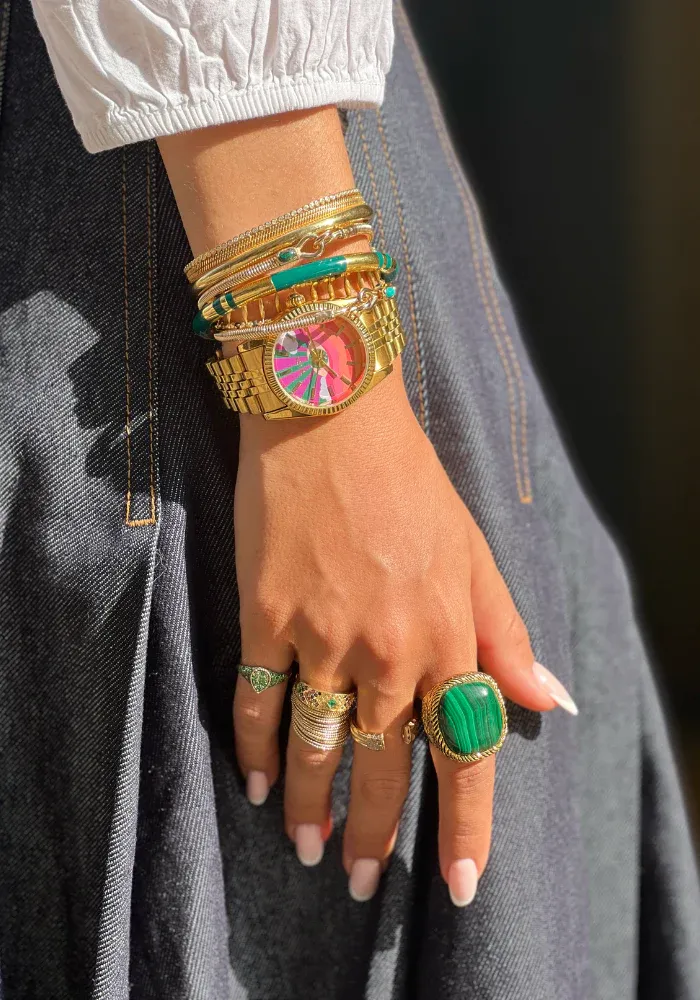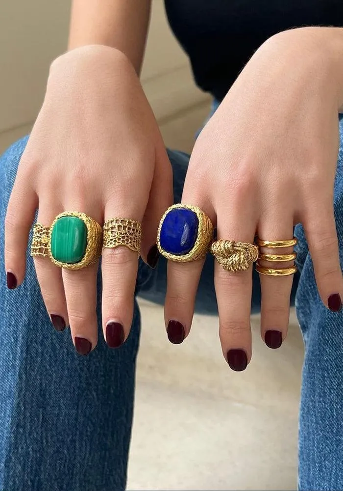 Véritable ode à la Californie, cette collection nous transporte dans un univers solaire. Les bagues aux généreuses pierres en turquoise, lapis lazuli ou malachite véritables ainsi que les mailles tressées nous rappellent des textures brutes et authentiques.