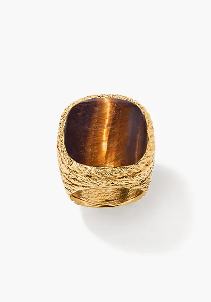 Bague Miki en plaqué or tressée avec une pierre rectangulaire d’oeil de tigre.