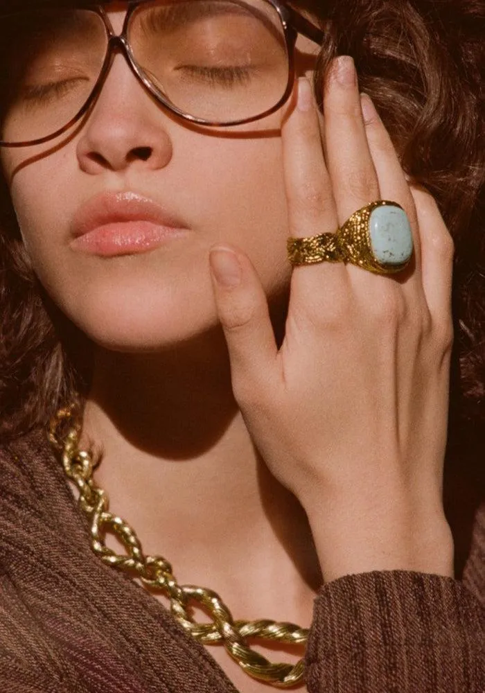 Bague Miki en plaqué or tressée avec une pierre rectangulaire.