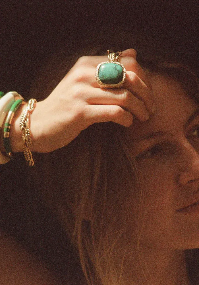 Véritable ode à la Californie, cette collection nous transporte dans un univers solaire. Les bagues aux généreuses pierres en turquoise, lapis lazuli ou malachite véritables ainsi que les mailles tressées nous rappellent des textures brutes et authentiques.