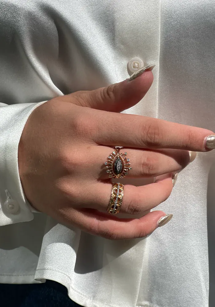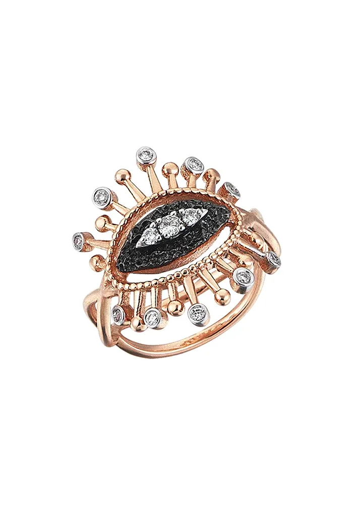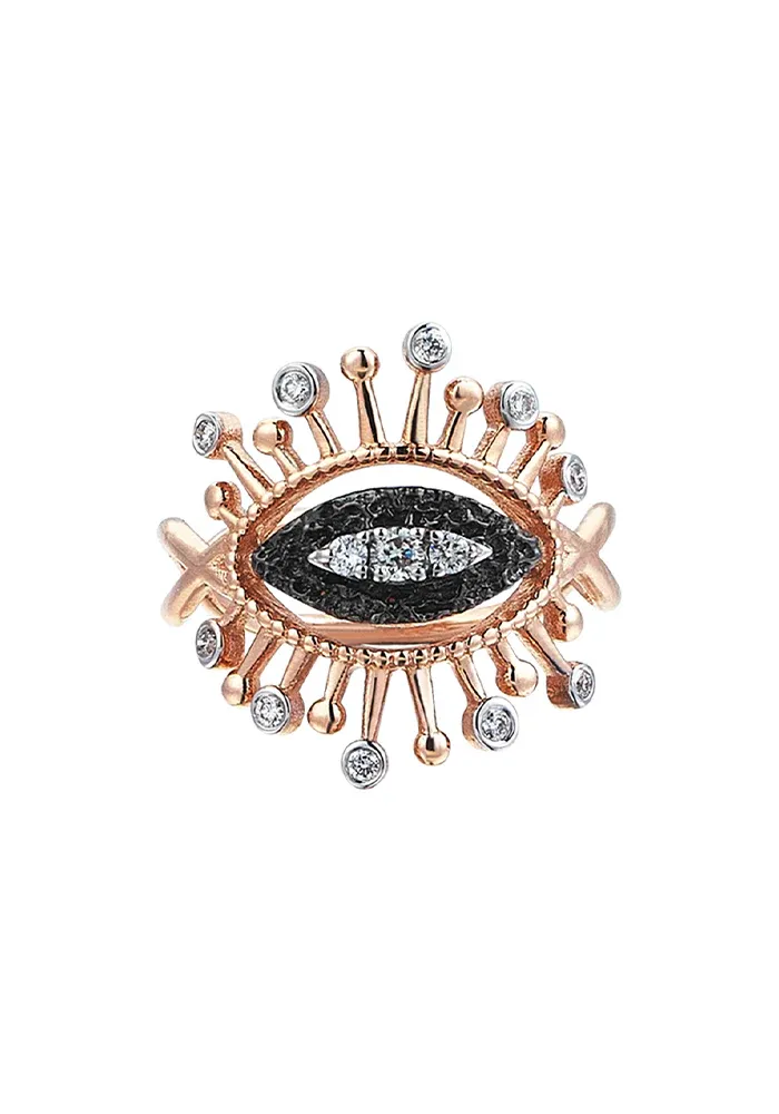 Bague en or rose 18 carats, avec au centre de l’oeil un pavé ovale de diamants blancs éblouissants au centre cils avec diamants blancs à l’extrémité des cils.