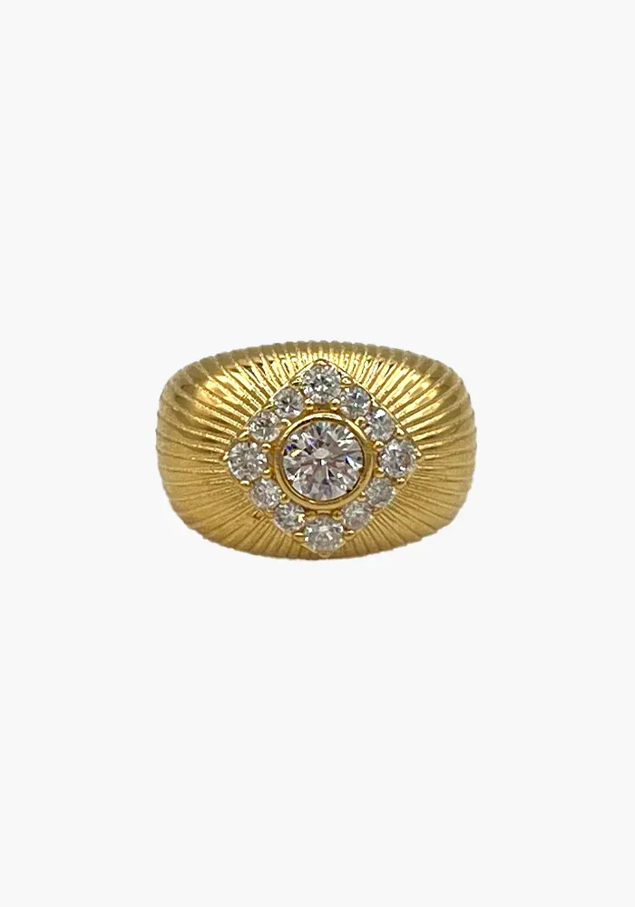 Bague en plaqué or bombée et striée décorée de strass.