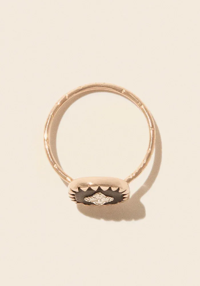 La bague Pierrot noire est en or rose et blanc et bakelite, incrustée d’un pavé de diamants polki.