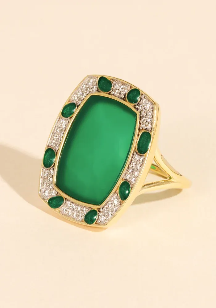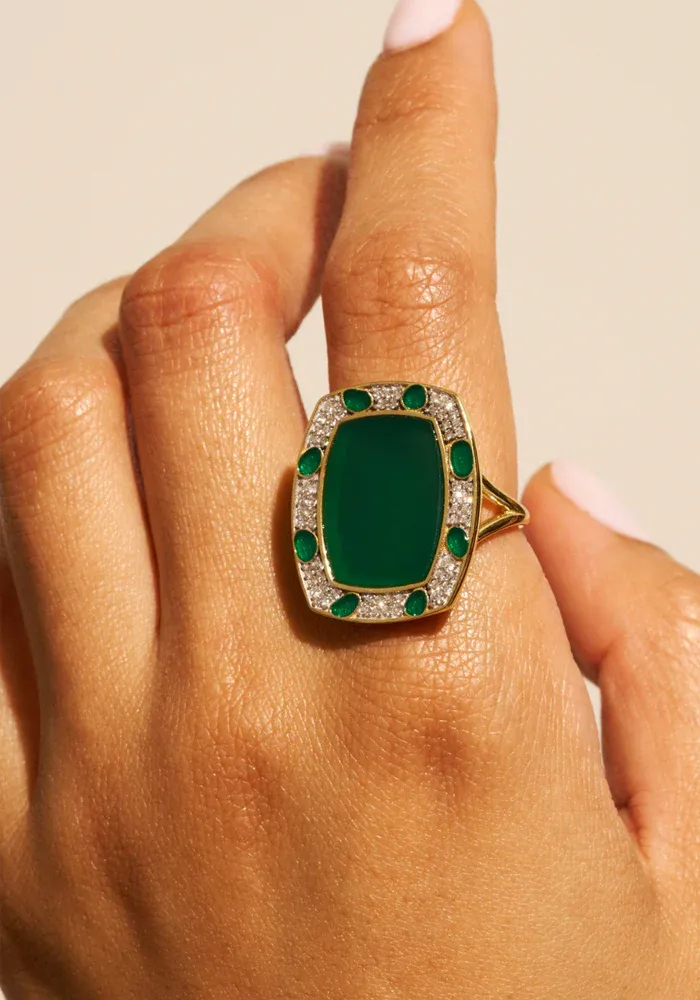 Bague Ranee en laiton doré à l’or fin 18 carats avec une grande pierre rectangulaire entourée de deux bandes de zircons et de résine colorée.