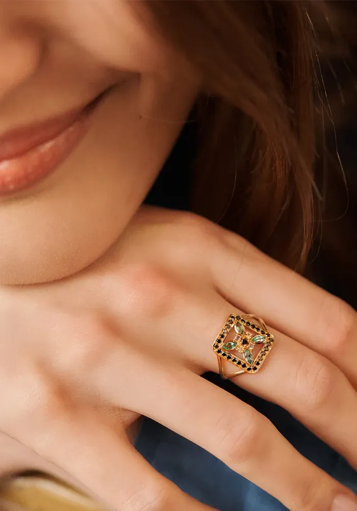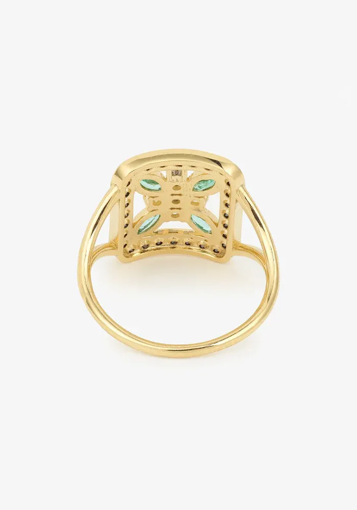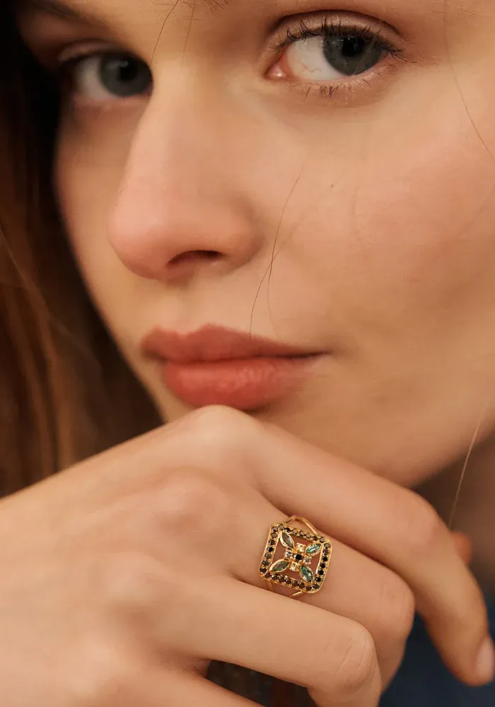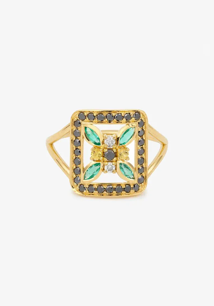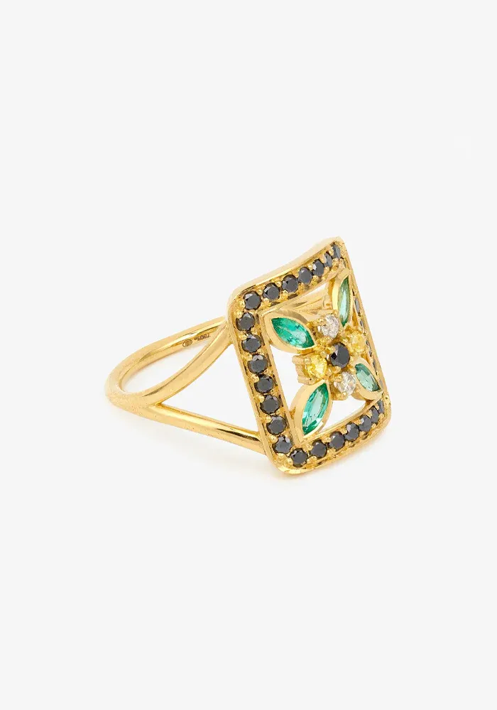 Bague Rita 4 Verte réalisée à la main en or jaune recyclé 18 carats et sertie de 37 pierres précieuses : 4 émeraudes taille Marquise, 2 saphirs jaunes, 29 diamants noirs et 2 diamants salt and pepper.