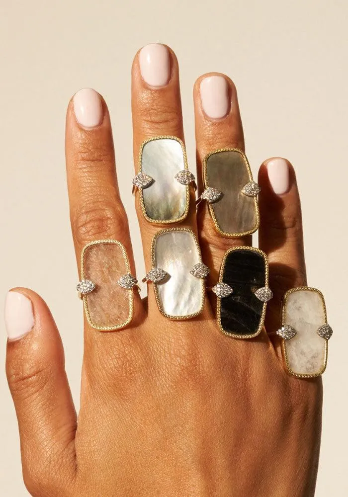 Bague Sangha avec une pierre rectangulaire aux bords arrondis sertie avec 2 losanges pavés de strass.