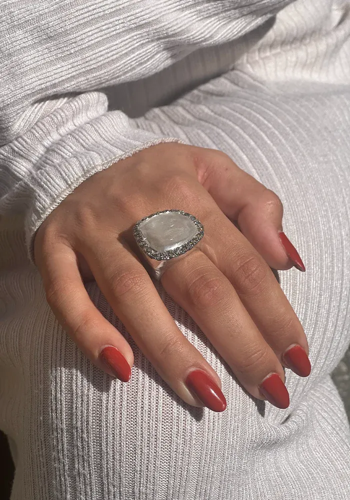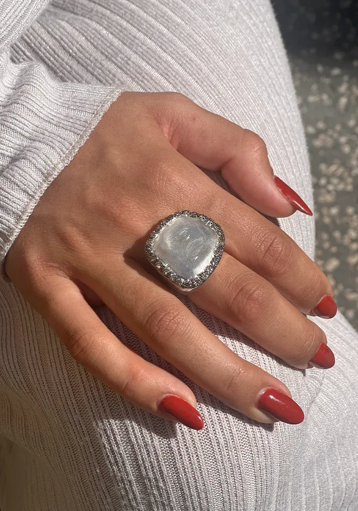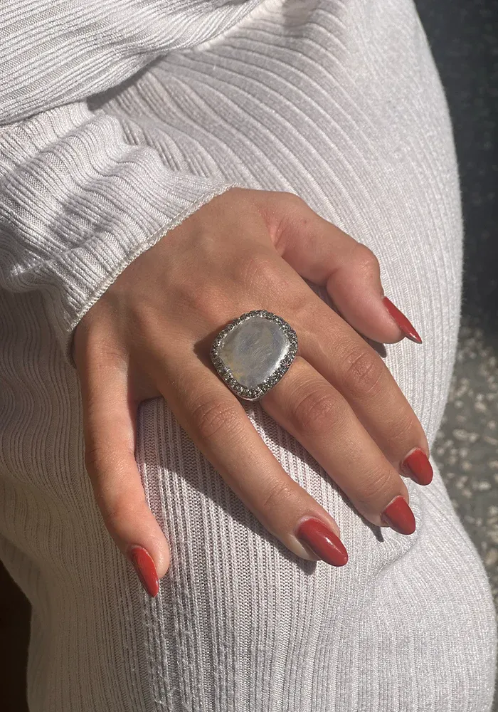 Bague Sirine en argent sterling avec une forme carré XXL sur le dessus avec un effet brossé et entouré de 26 diamants cognacs.