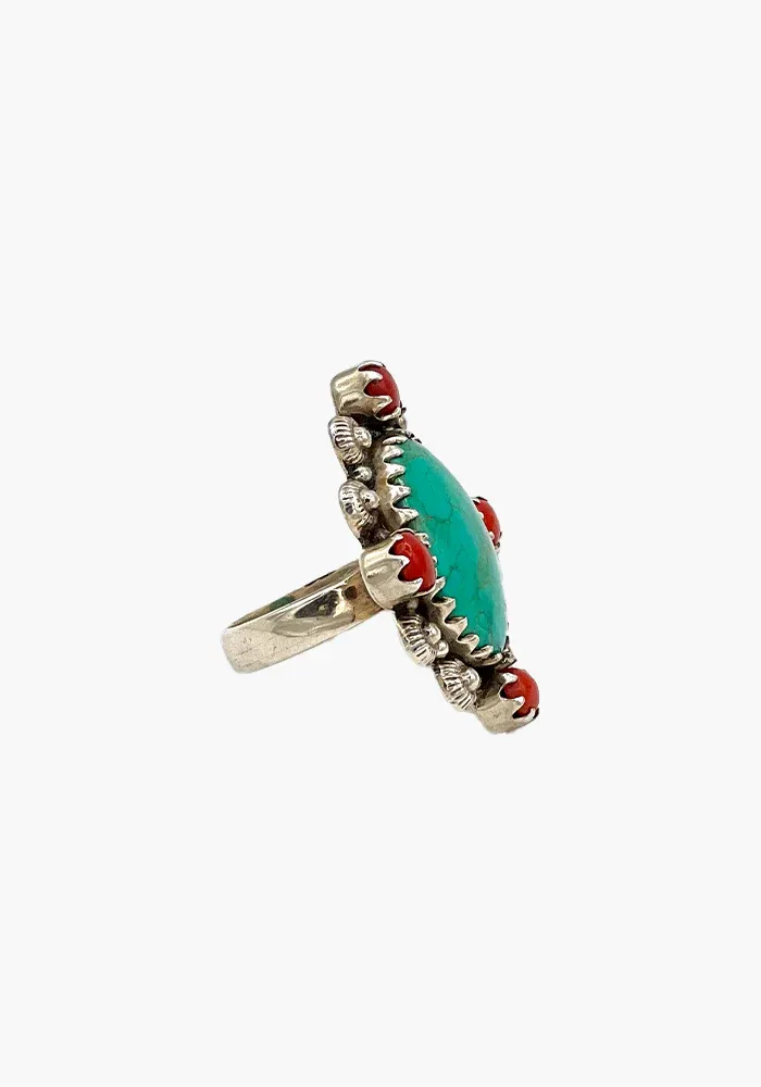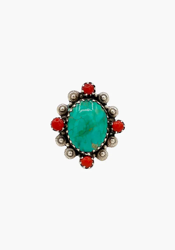 Bague en argent avec une turquoise ovale et entourée de 4 pierres de corail.