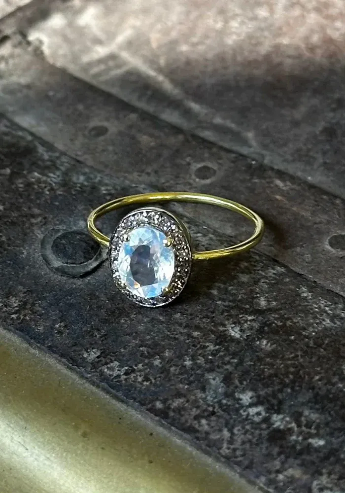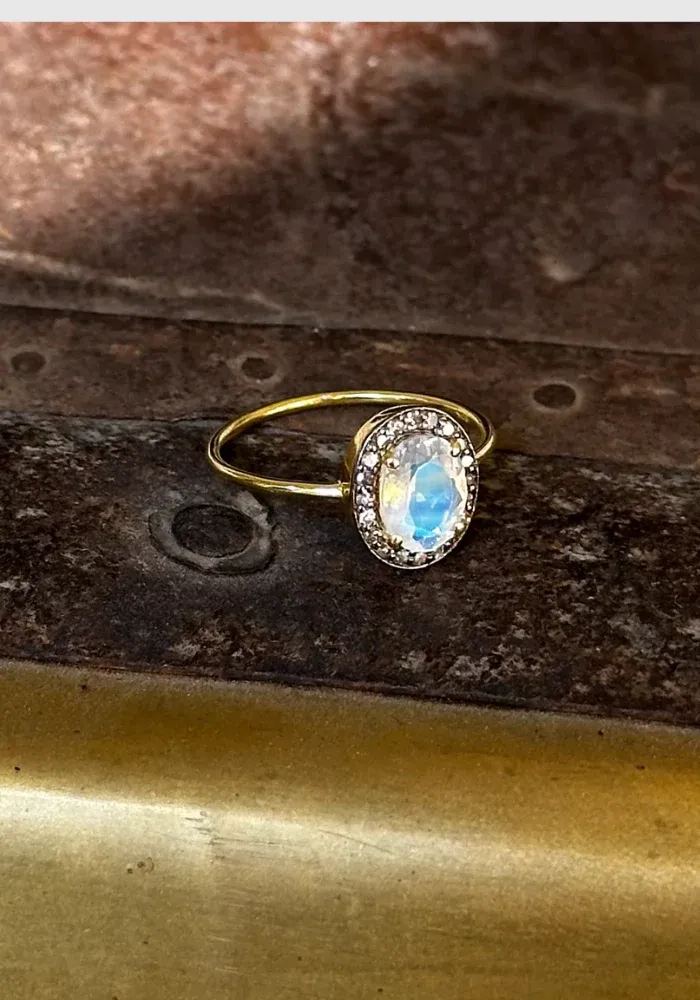 Bague Victoria en vermeil de forme ovale en argent et plaqué or trois microns sertie de mini diamants et de pierre de lune.