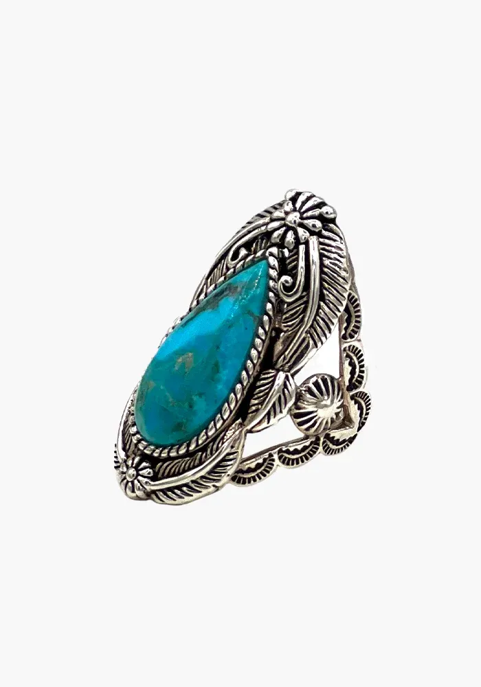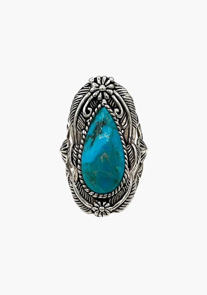 Bague en argent 925 avec une turquoise en goutte au centre et des motifs autour.