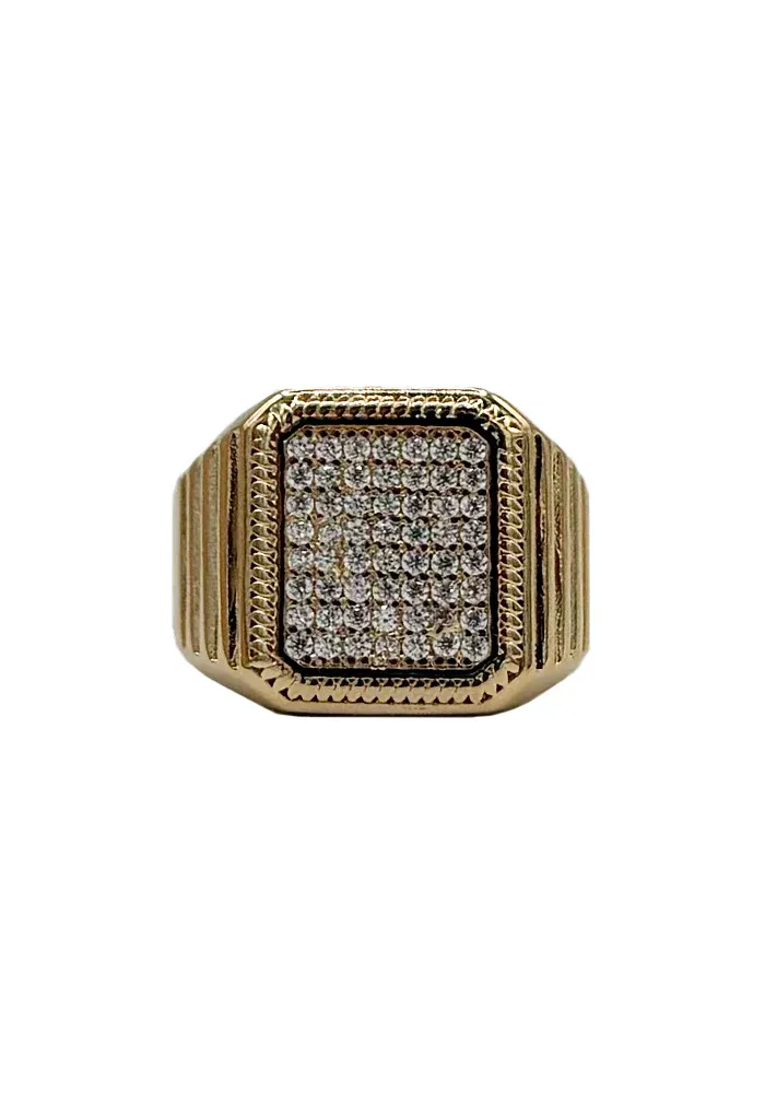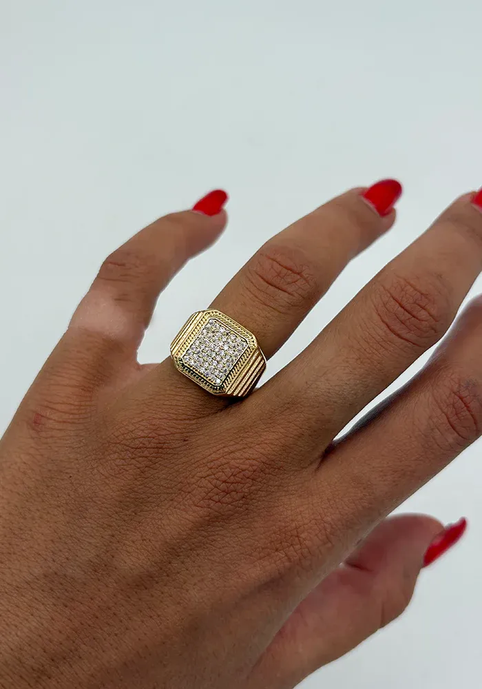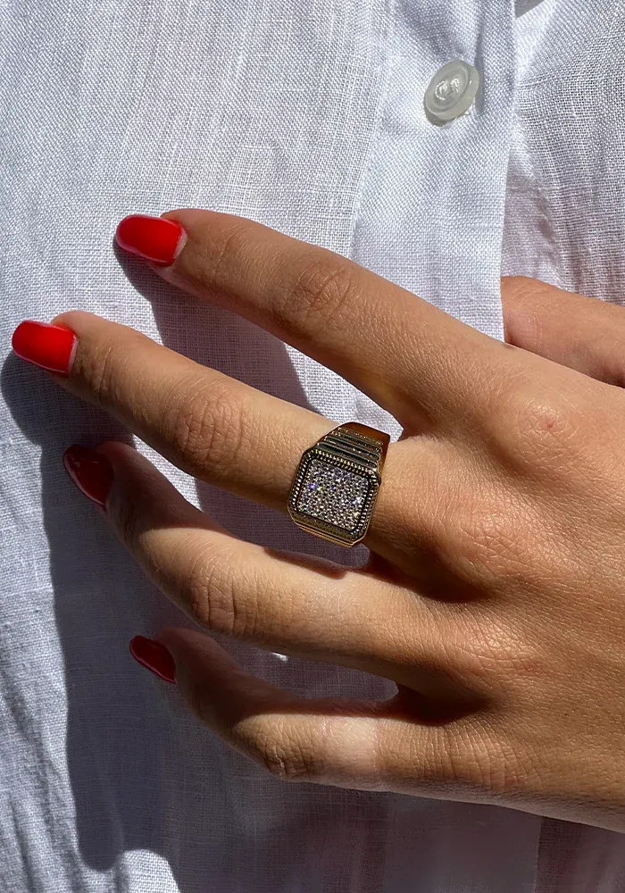 La bague Zia est une chevalière octogonale sertie de strass, rehaussée d’un serti mini tresse qui encadre délicatement le pavage.