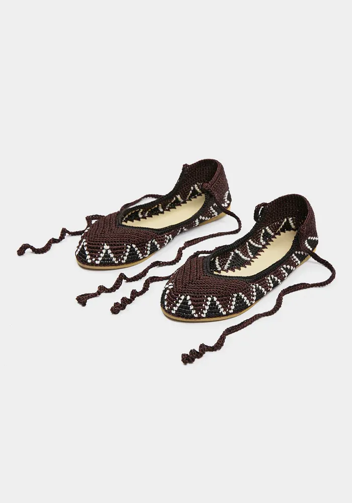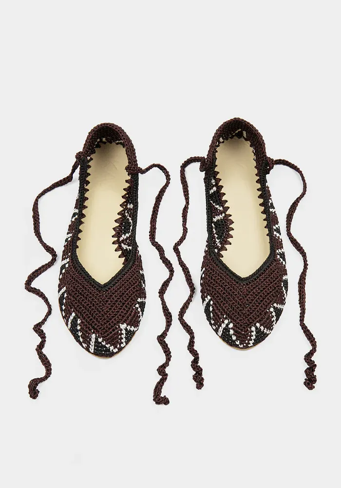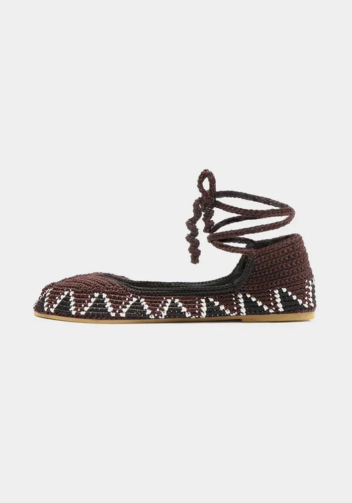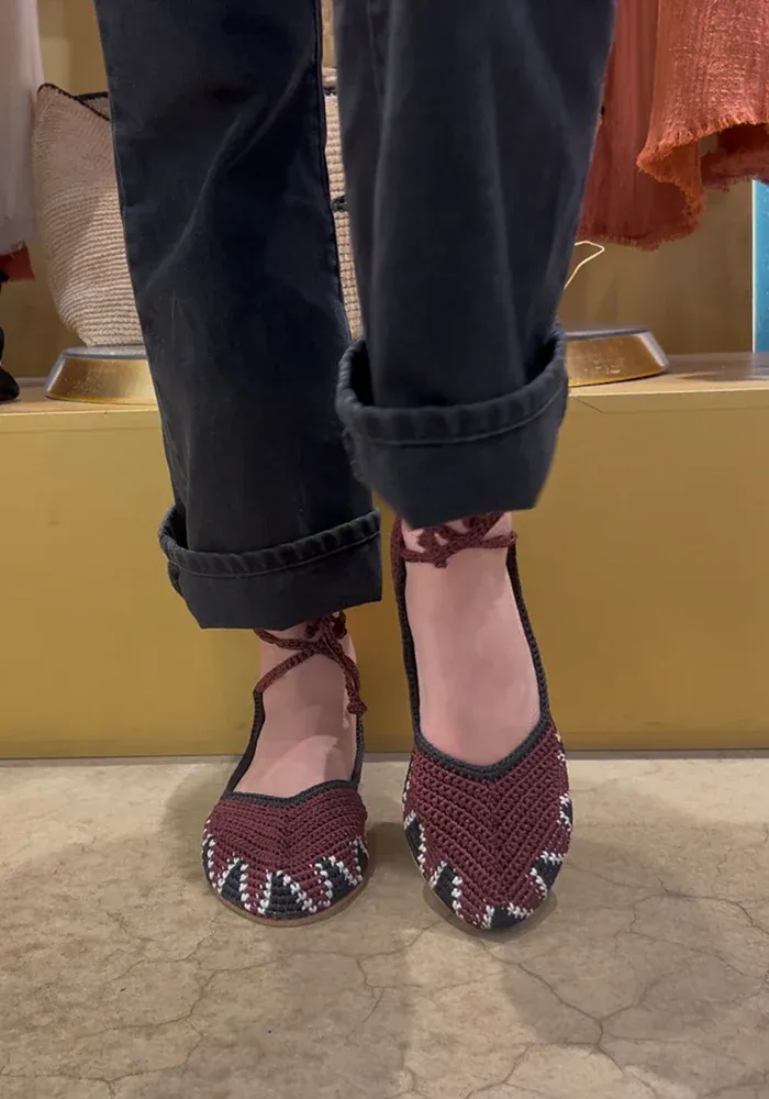Ballerines High Grape Red en crochet bordeaux, noir et blanc avec une fermeture à lacets.