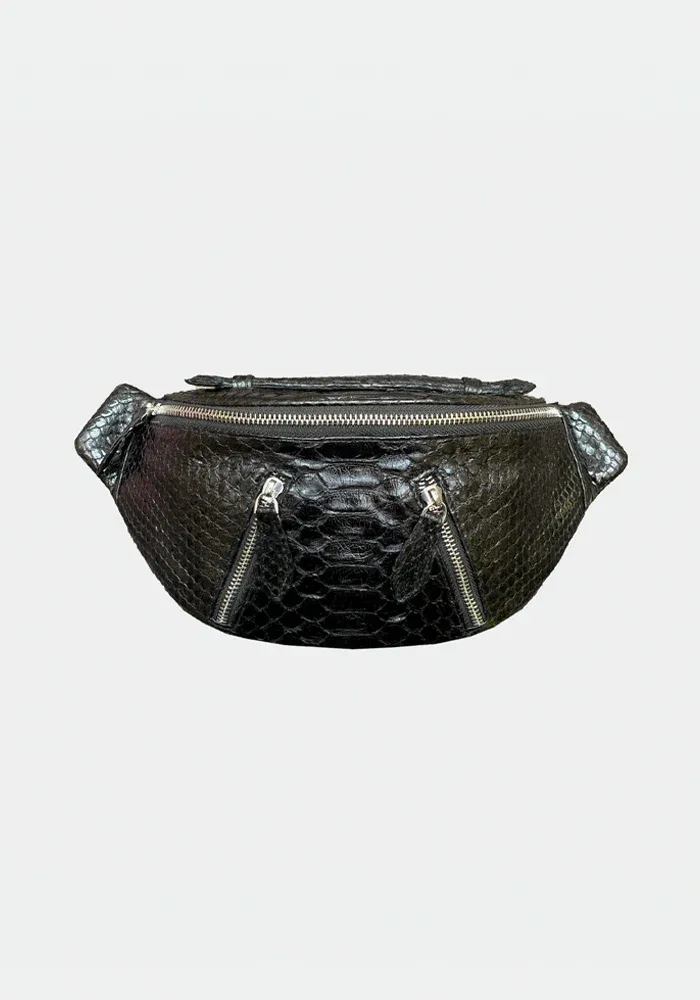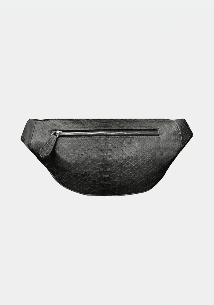 Sac banane Mike en python noir avec deux fermeture éclair décorative à l’avant.