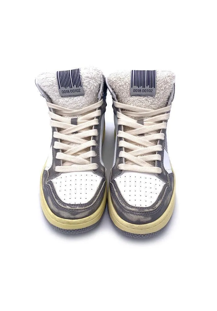 Baskets P7bw hautes blanches avec code barre sur le côté et peinture grise sur tous les bords.