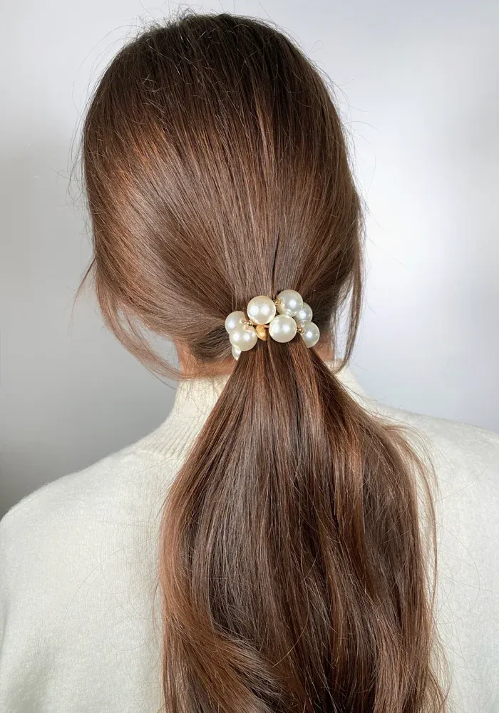 Bichou bracelet-chouchou avec des perles nacrées autour d’un élastique.