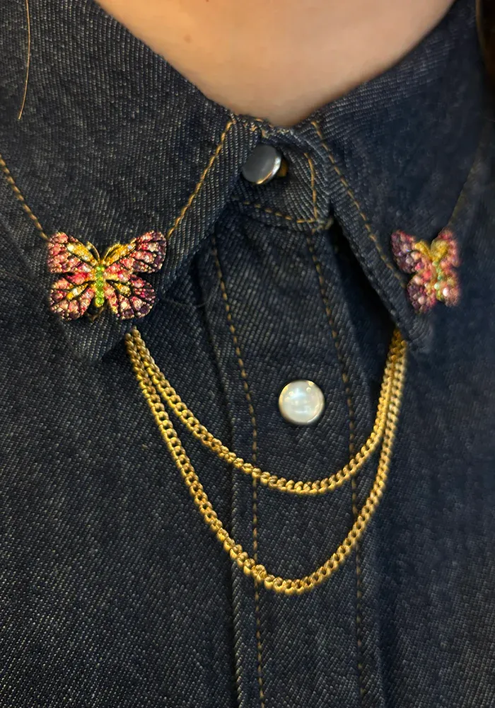 Bijou de col Laya avec 2 pin’s en forme de papillons décorés de strass et deux chaines dorées reliant les pin’s.