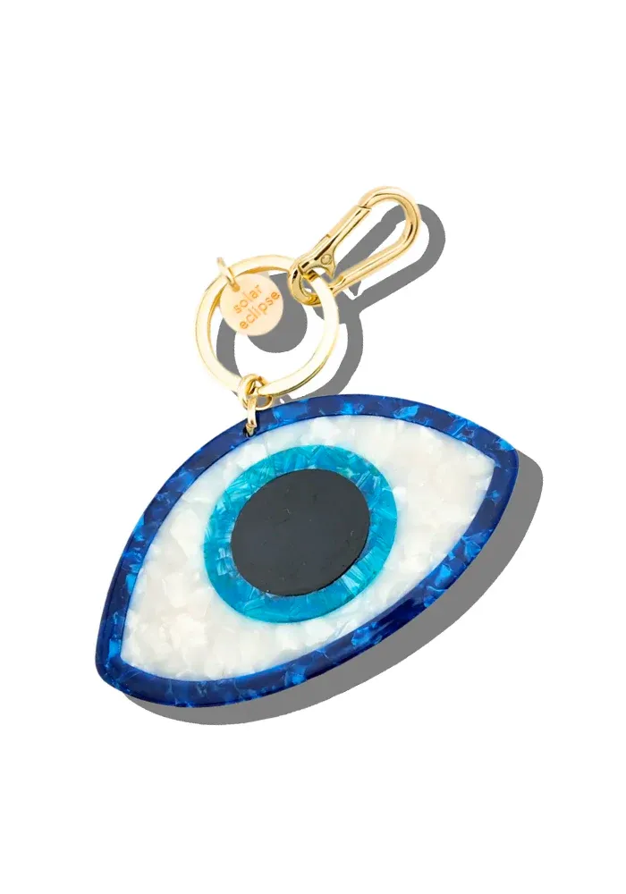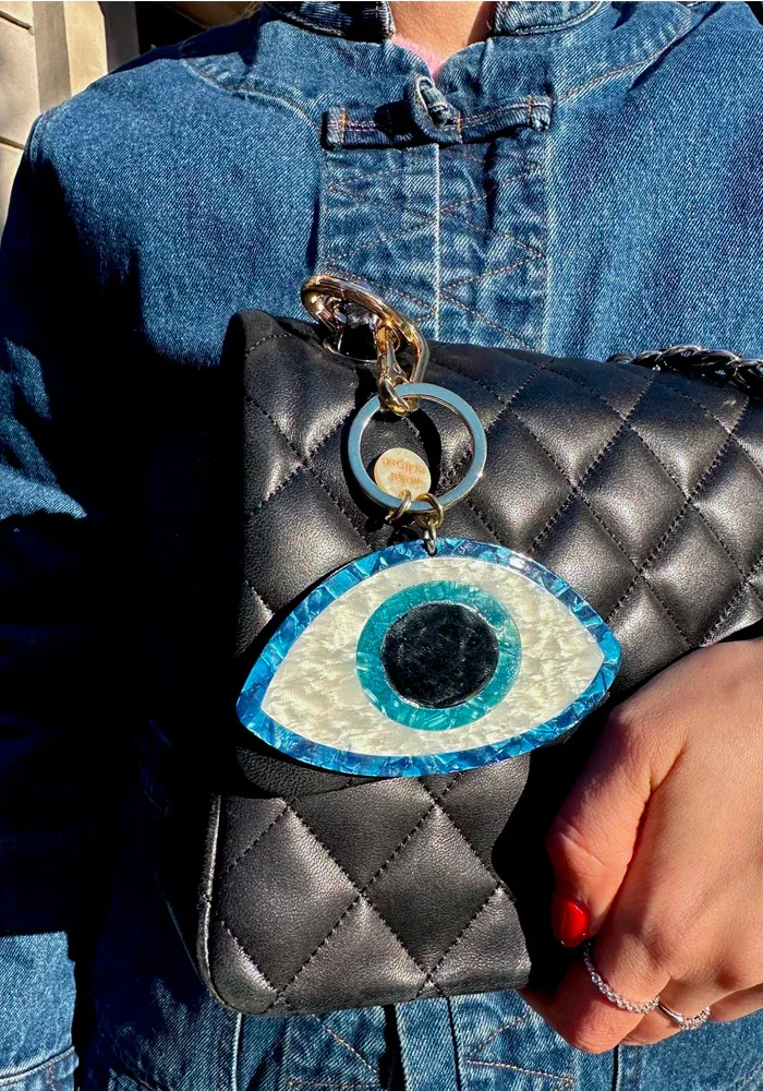 Bijou de sac motif mauvais oeil en acétate de cellulose.