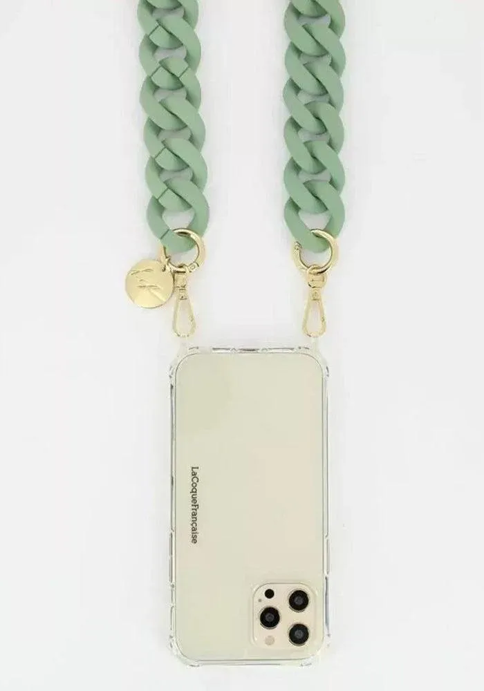 Bijou de téléphone à maillons en résine vert clair matte grand modèle avec mousquetons dorés.