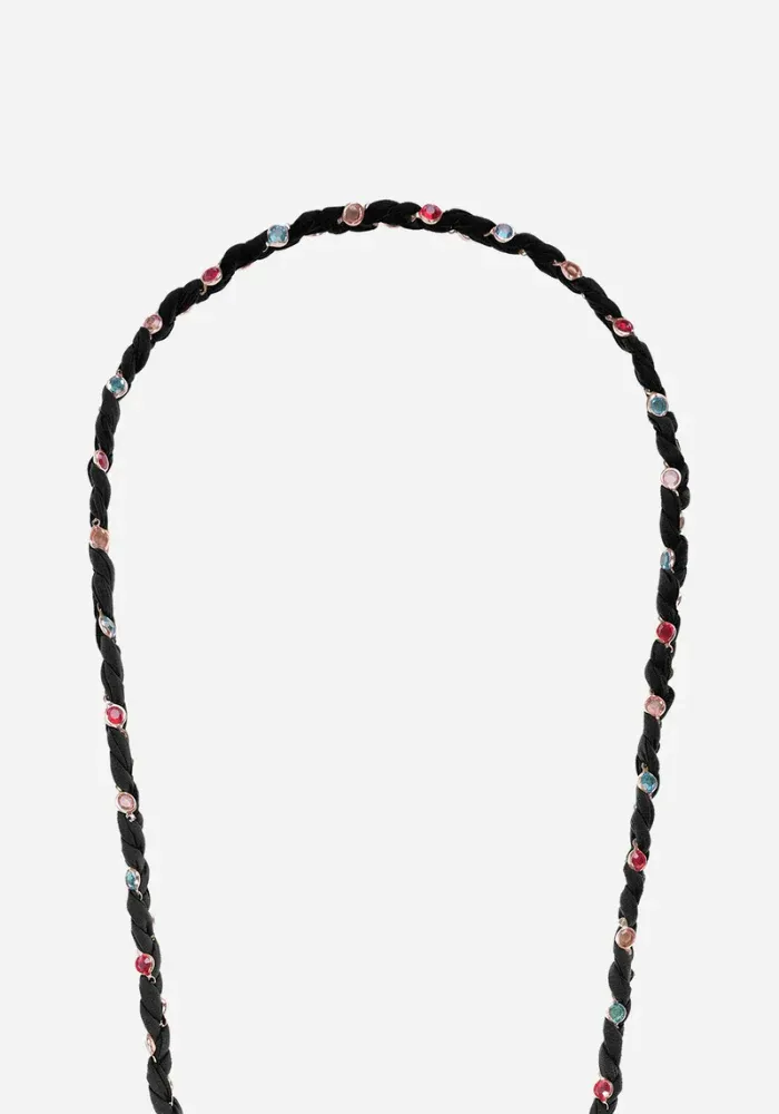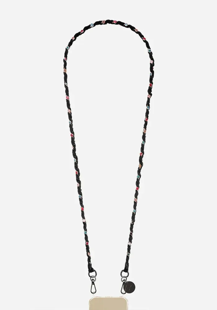 Bijou de téléphone Doha noir doré, composé d’une tresse en coton noir et de cristaux multicolores.