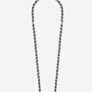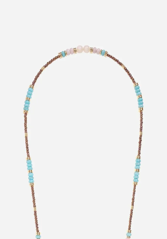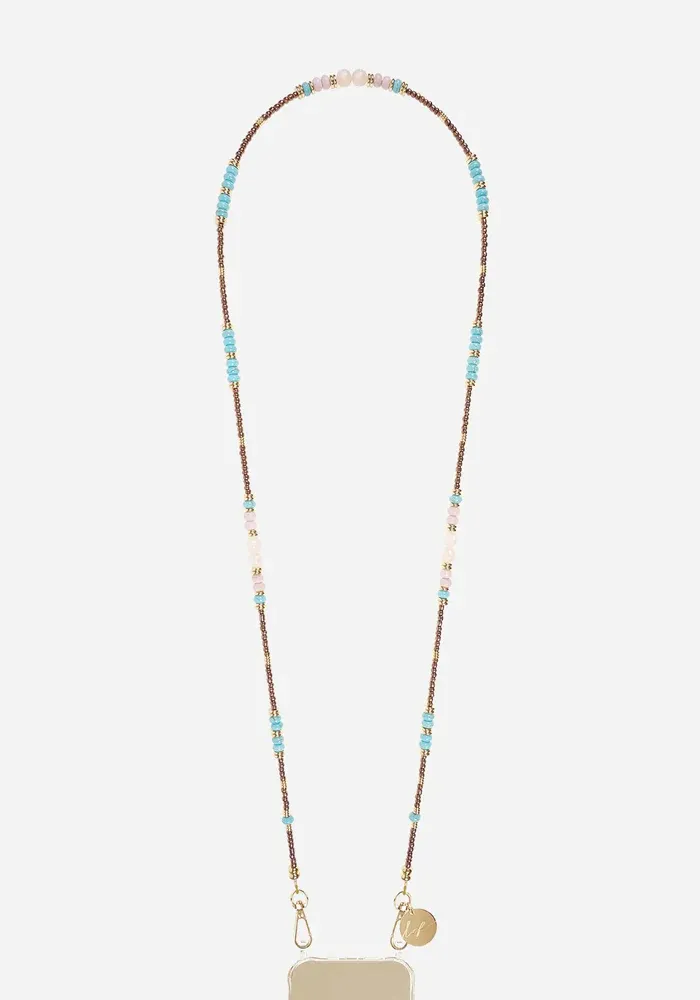 Bijou de téléphone Iliana marron et turquoise, composé de perles en verre bronze, de perles œil de chat et de pampilles dorées.