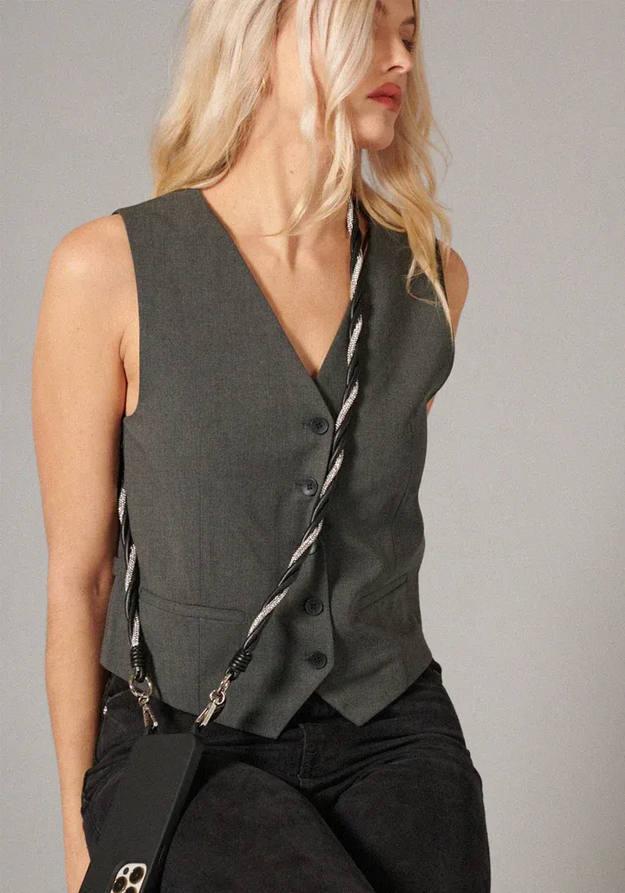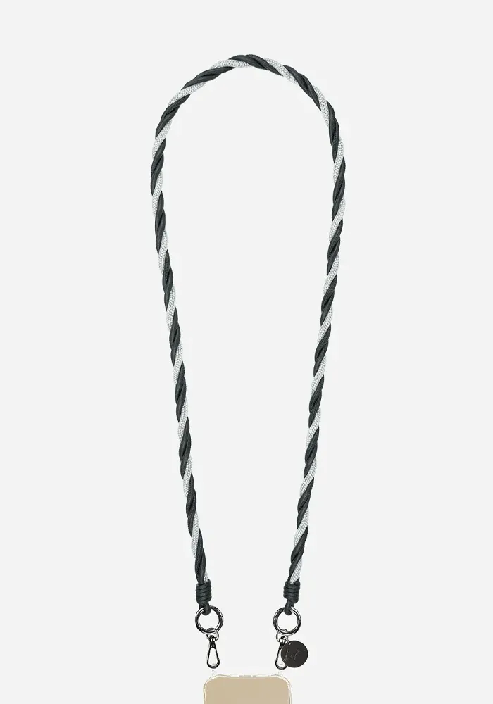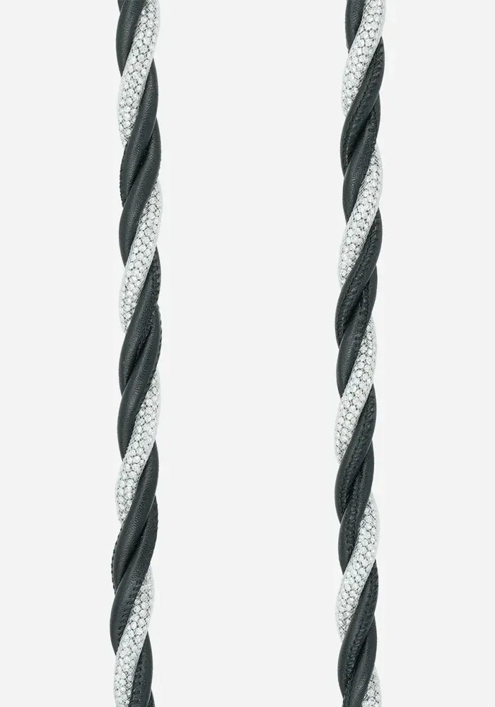 Bijou de téléphone Joe noir et argent avec deux cordons noirs en cuir vegan enroulés d’un cordon argent pailleté.