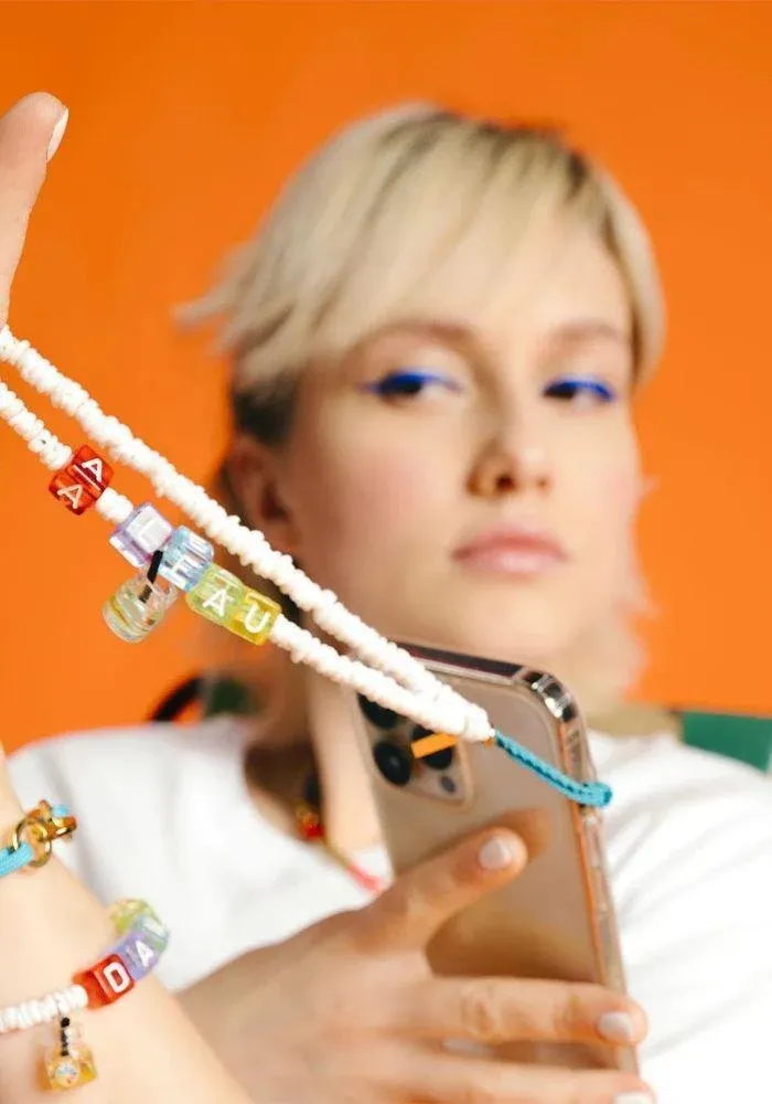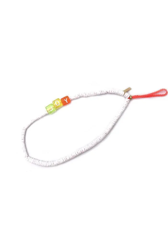 Bijoux de téléphone avec perles blanches et message « Joy »