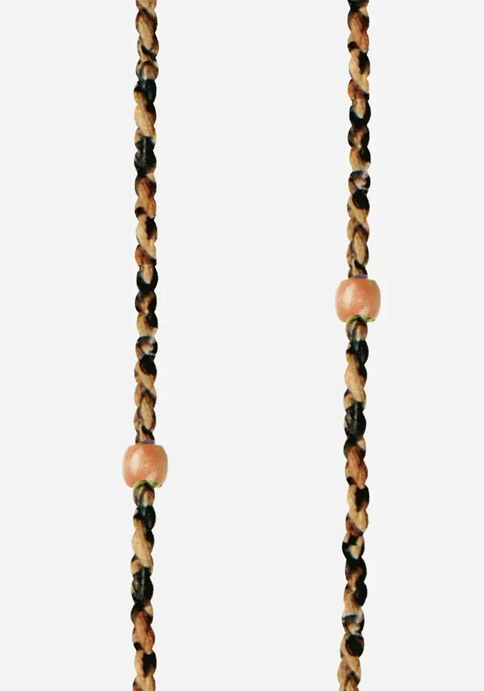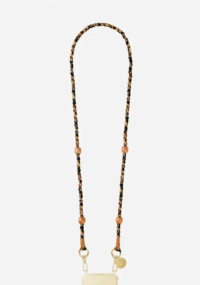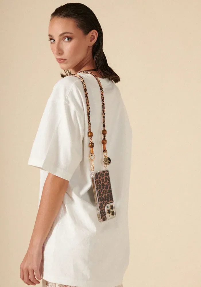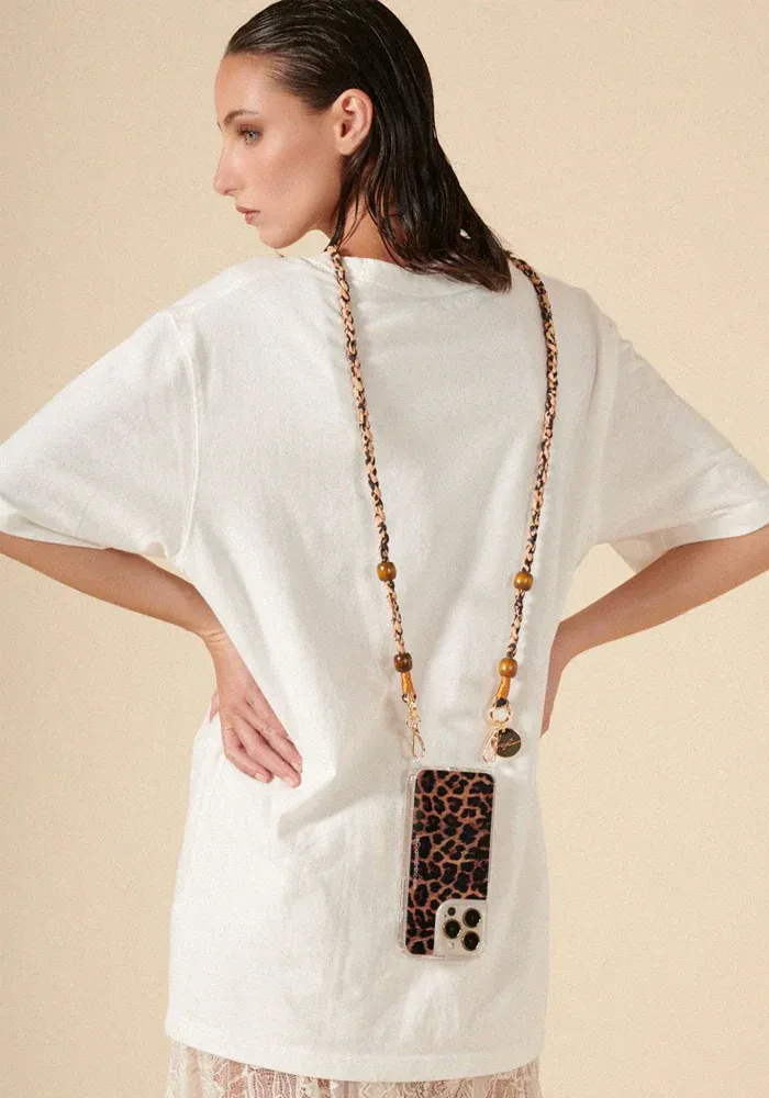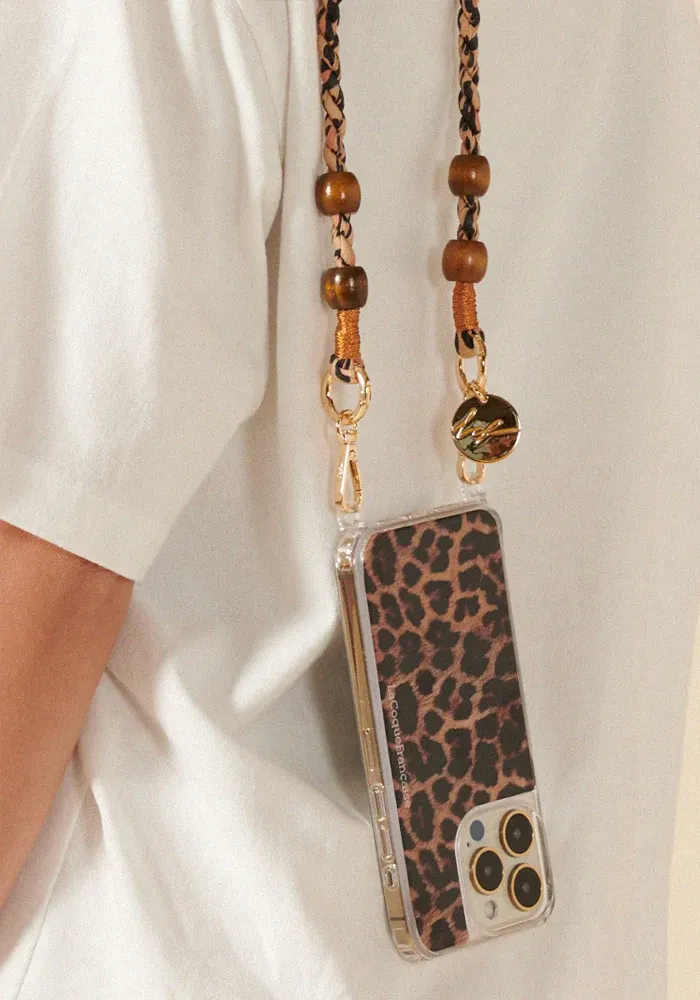 Bijou de téléphone Léo avec un cordon en coton tressé imprimé léopard et des perles en bois.