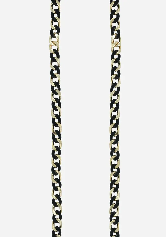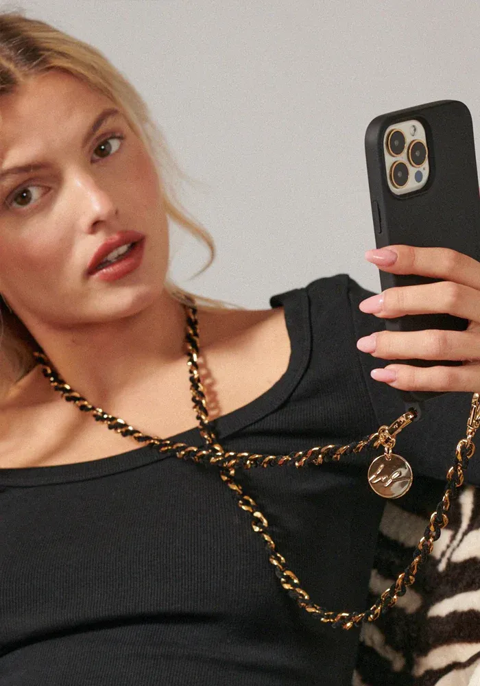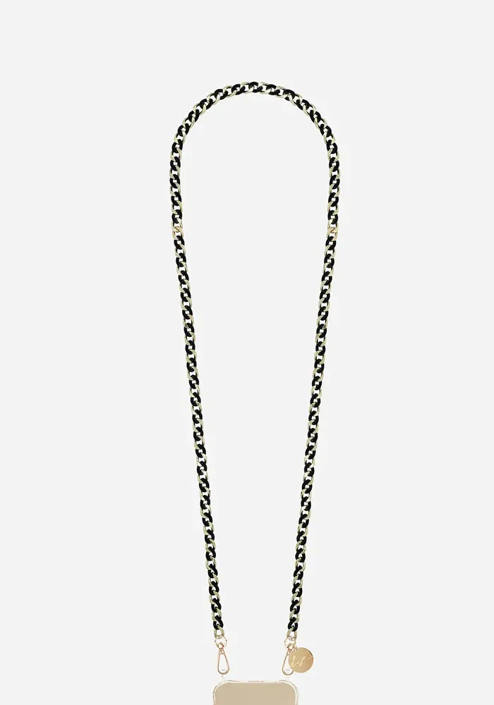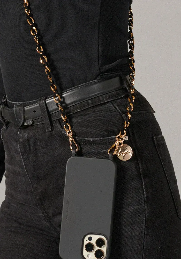 Bijou de téléphone Sona avec une chaine mi métal dorée mi velours noir.